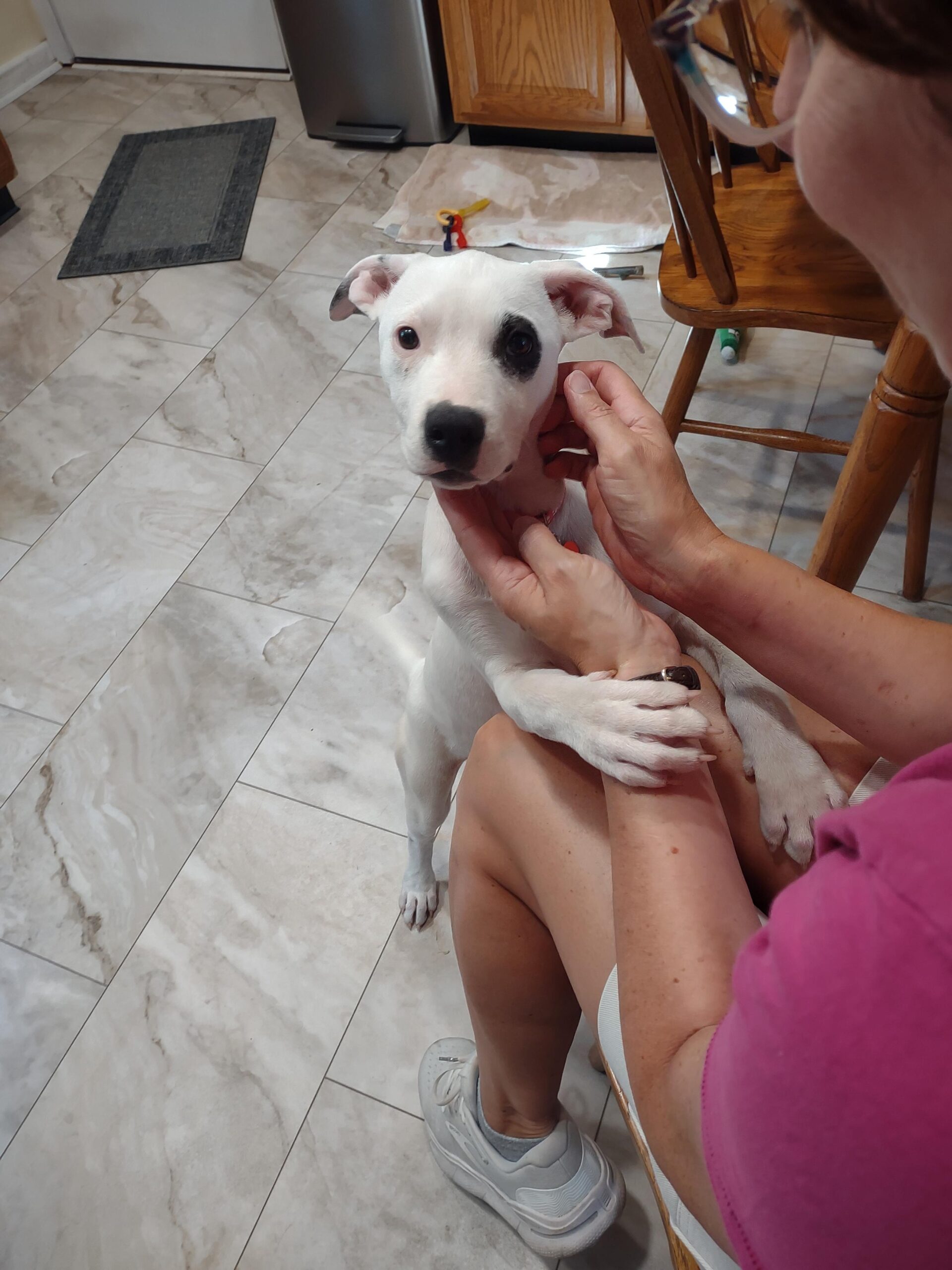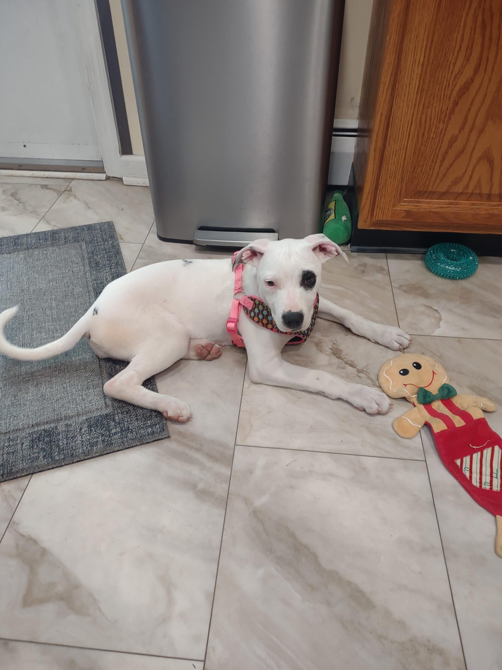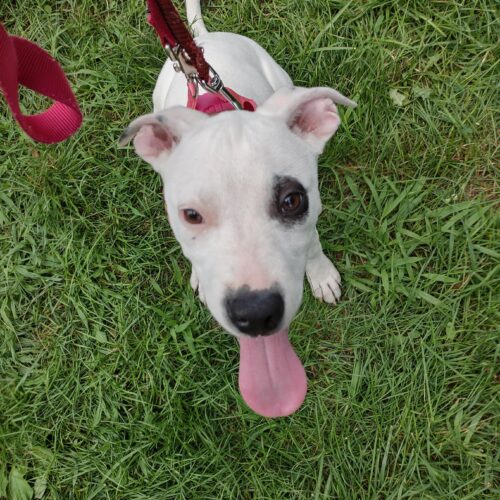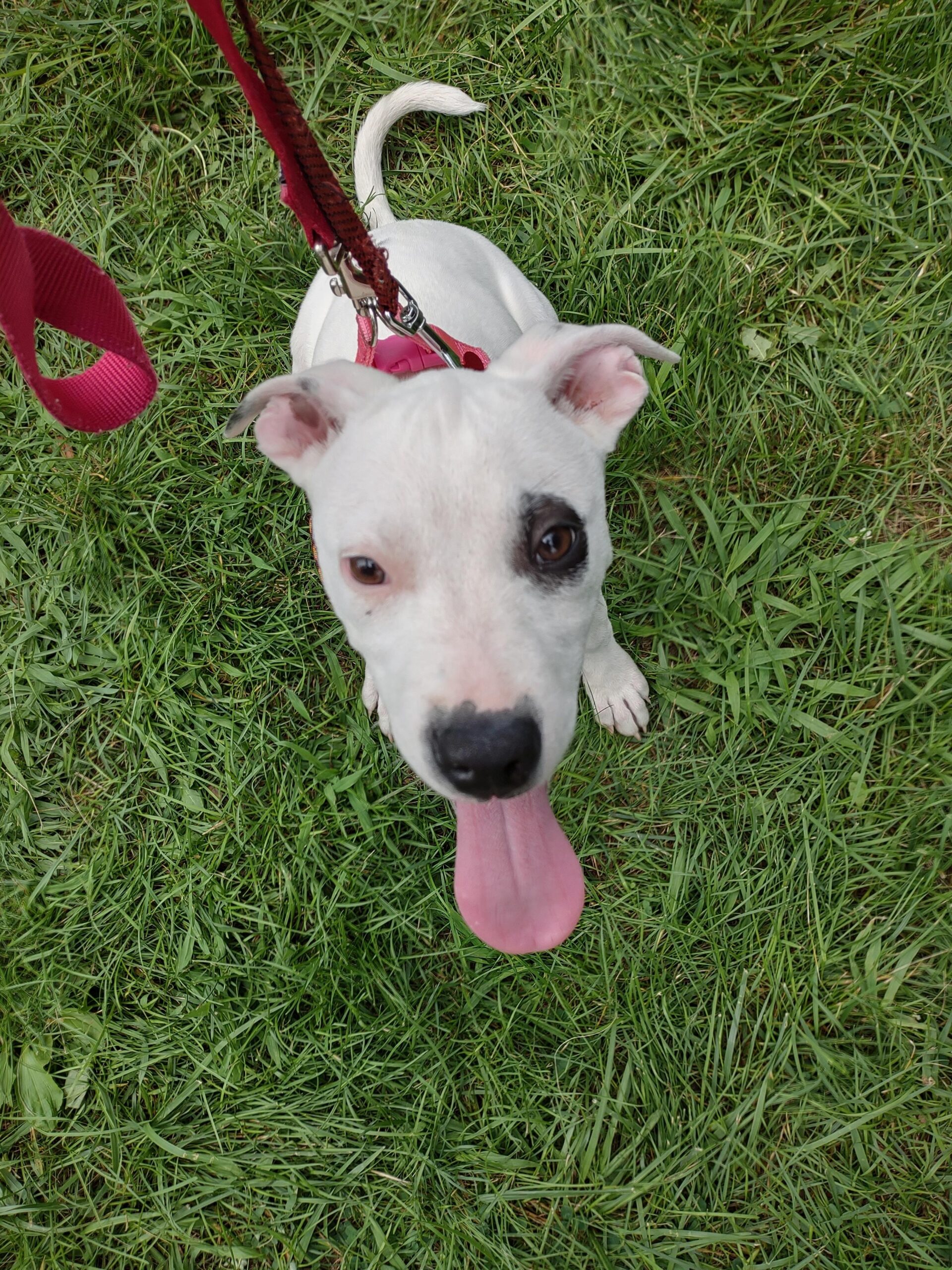 This is Abigail. She's a super-sweet, three- month-old female pit mix who weighs about 20 pounds. She has a beautiful white coat with a sprinkling of freckles and a well-placed circle around her left eye. Abigail's living happily with two medium-sized dogs in her foster home, and she's doing great with her housetraining and crate training. Abigail is very treat motivated and eager to learn. She loves meeting everyone at the adoption events and on her daily walks. Abigail loves being outside but is happy to come inside and cool off. She's a champion snuggler, and her favorite thing is giving kisses. Abigail would love to meet her new forever family and begin her new life.