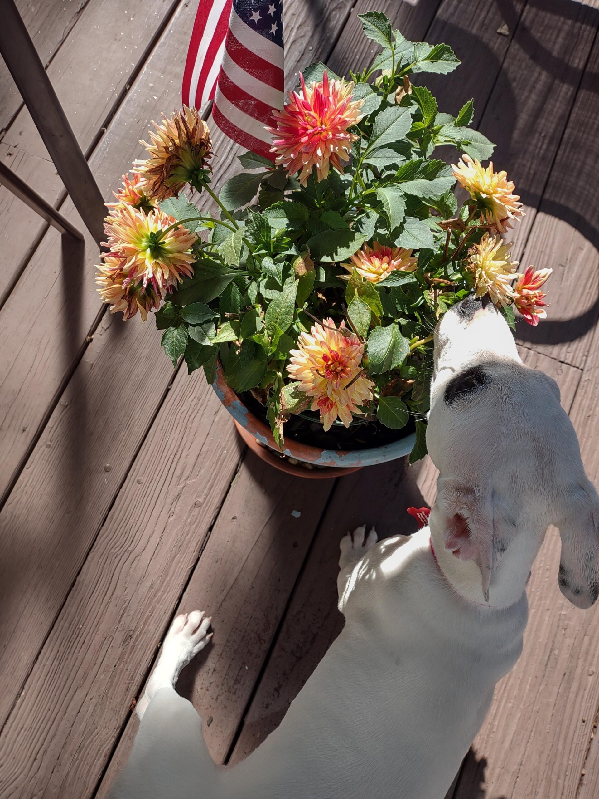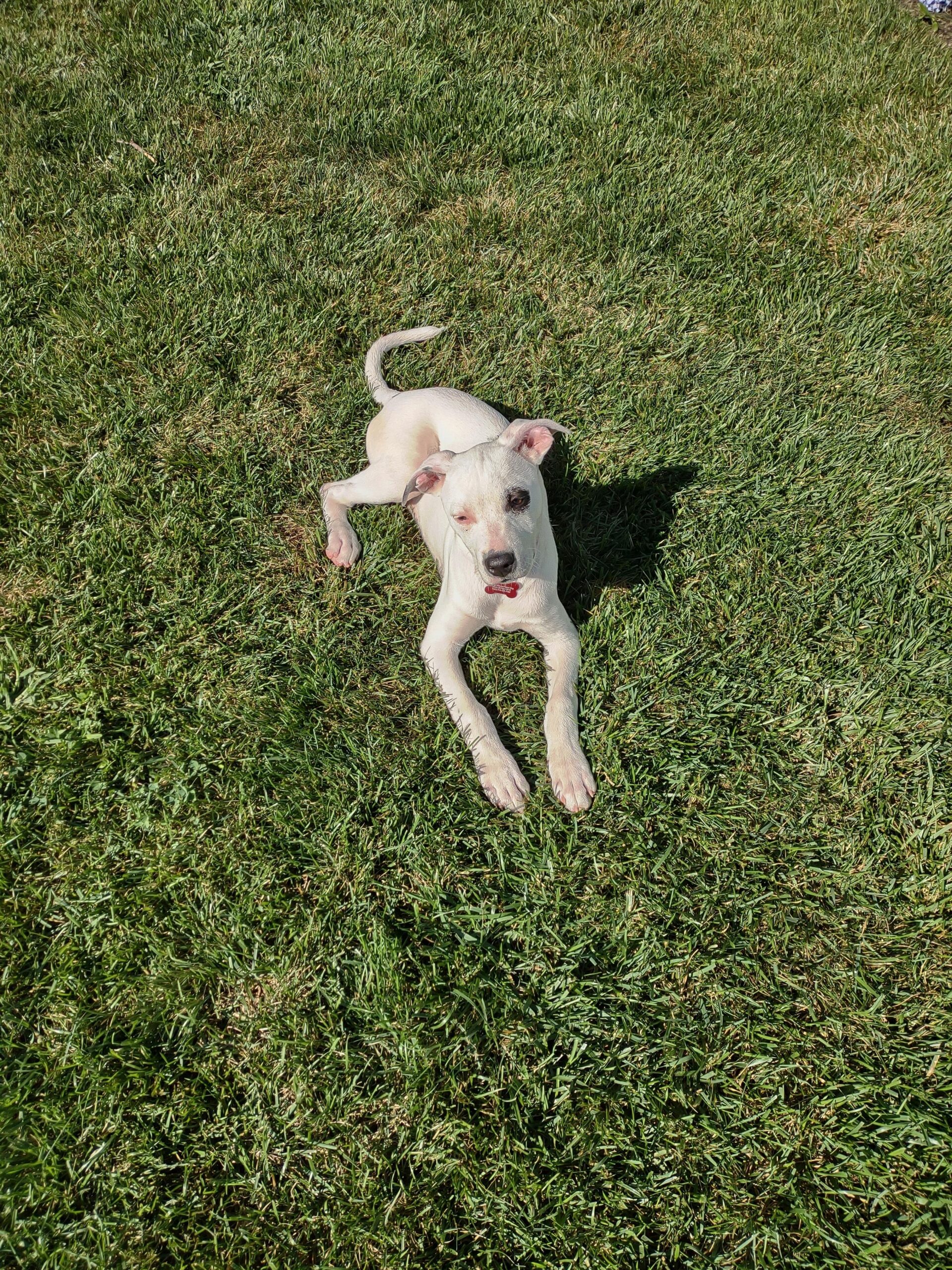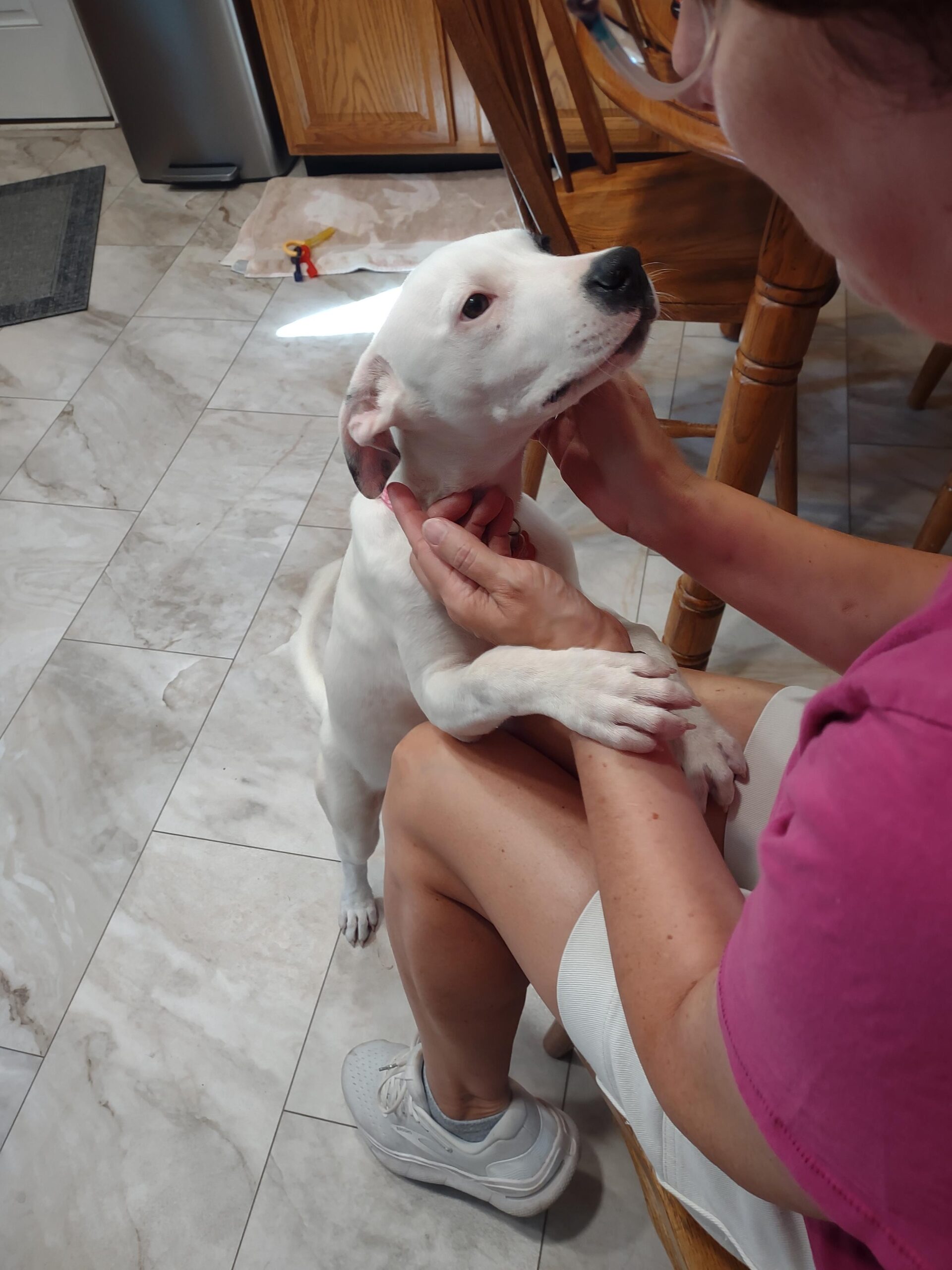 This is Abigail. She's a super-sweet, three- month-old female pit mix who weighs about 20 pounds. She has a beautiful white coat with a sprinkling of freckles and a well-placed circle around her left eye. Abigail's living happily with two medium-sized dogs in her foster home, and she's doing great with her housetraining and crate training. Abigail is very treat motivated and eager to learn. She loves meeting everyone at the adoption events and on her daily walks. Abigail loves being outside but is happy to come inside and cool off. She's a champion snuggler, and her favorite thing is giving kisses. Abigail would love to meet her new forever family and begin her new life.