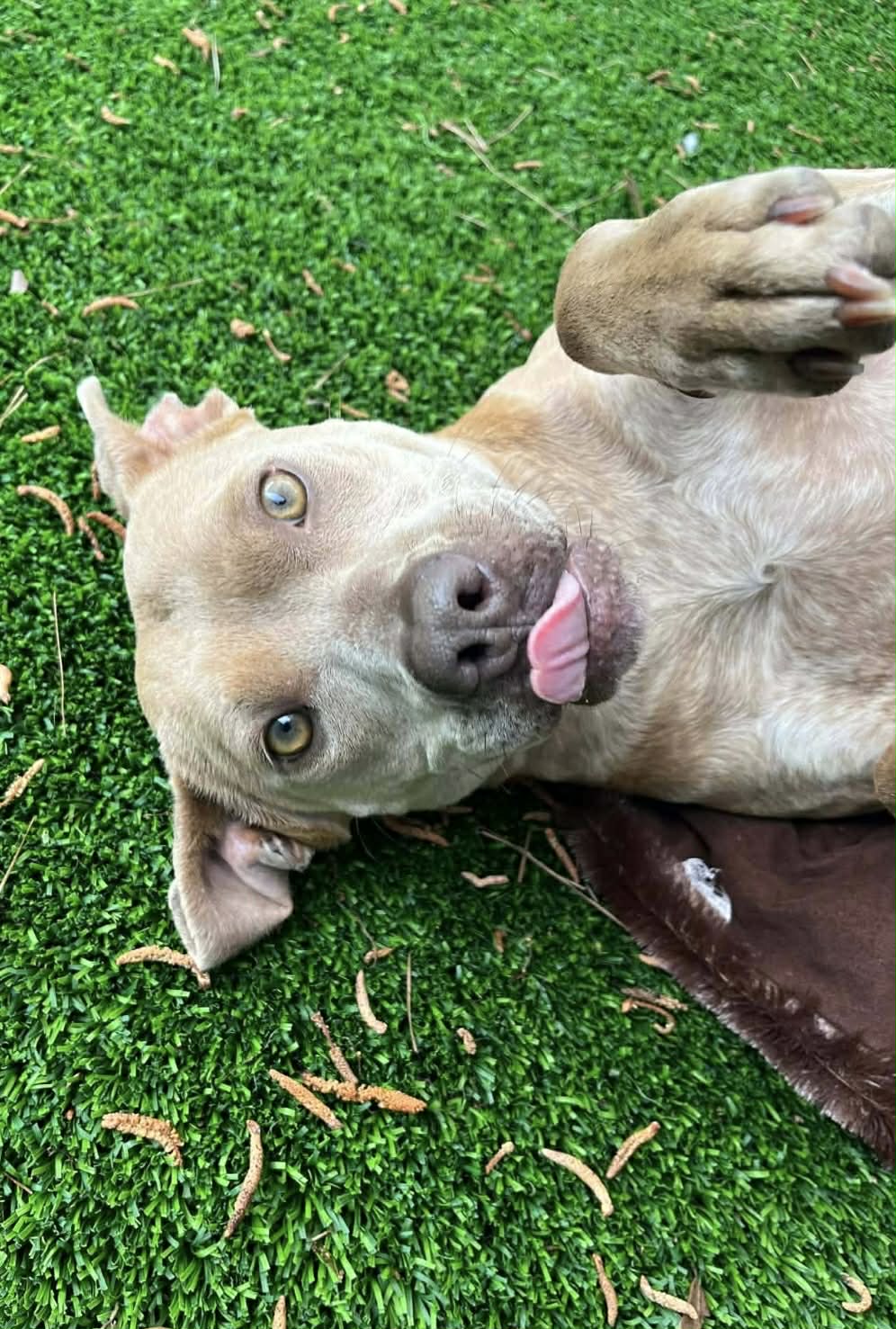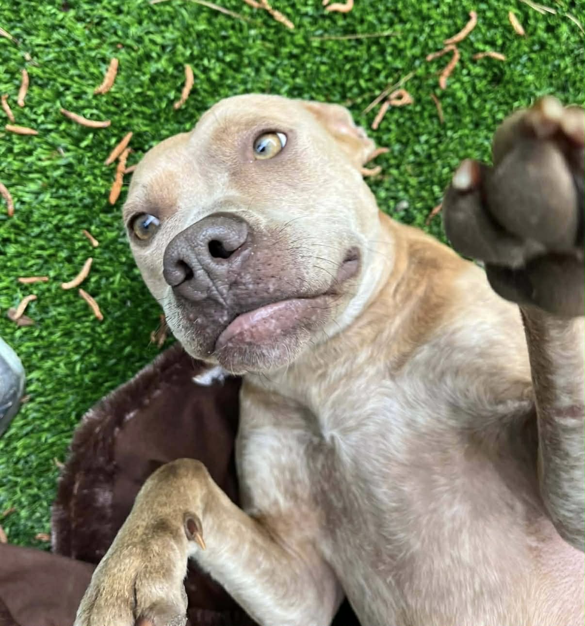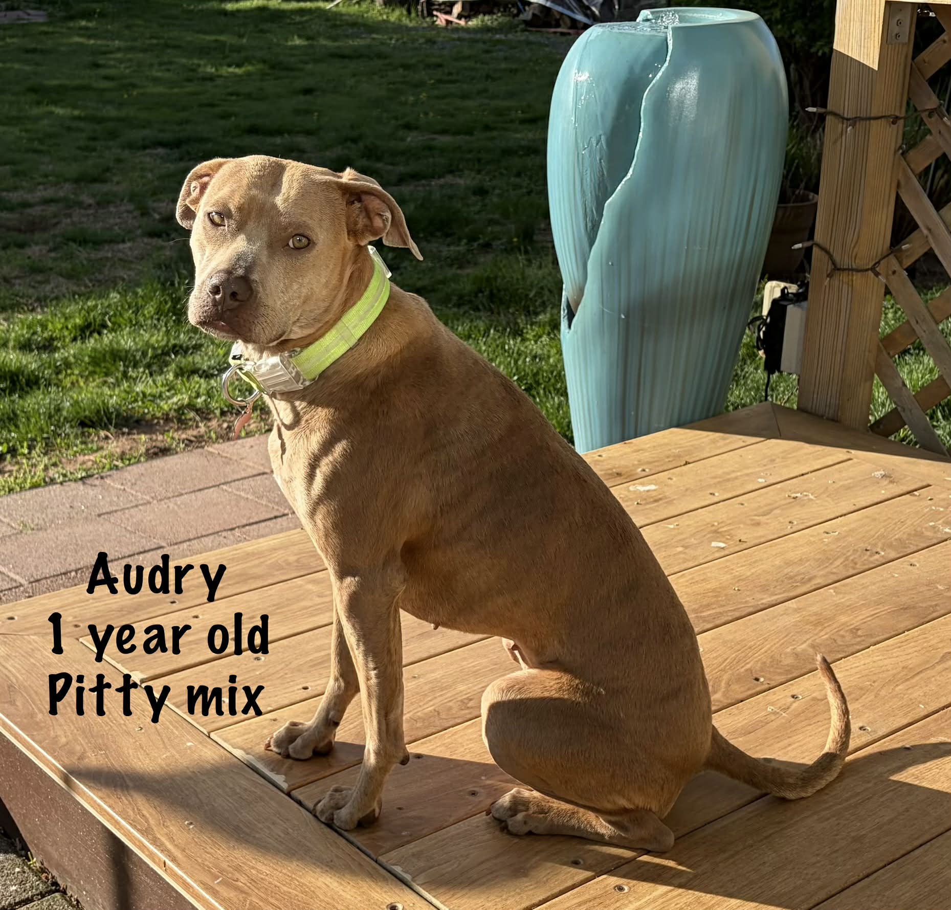 Audry is a 1 year old pitty (possibly boxer) mix that weighs approx 40 lbs. She is spayed and up to date on all preventatives. She is a friendly, happy, playful girl that gets along great with other dogs. She’s sleeps quietly all night in her crate. She has had no bathroom accidents in her current fosters home. She does still show puppy antics like jumping up on you and chewing things that she shouldn’t, but swift correction and redirection is helping with training. Also like a puppy, she has energy to burn, a long walk or playful activities will reward you with snuggles and cuddles! She would be best suited with kids above 10…at least until the jumping is corrected! She walks really well on the leash, rides really well in the car and her favorite things in life are being with her humans, wagging that beautiful butt and licking, she’s a lovable, lively, likable, licking machine! Now that the formalities are out of the way, can we talk about those eyes?! Stunning golden eyes that perfectly match her super soft golden coat! They suck you in! And how bout that bottom lip! The perfect pouty lip that melts your heart. She’s a beauty!