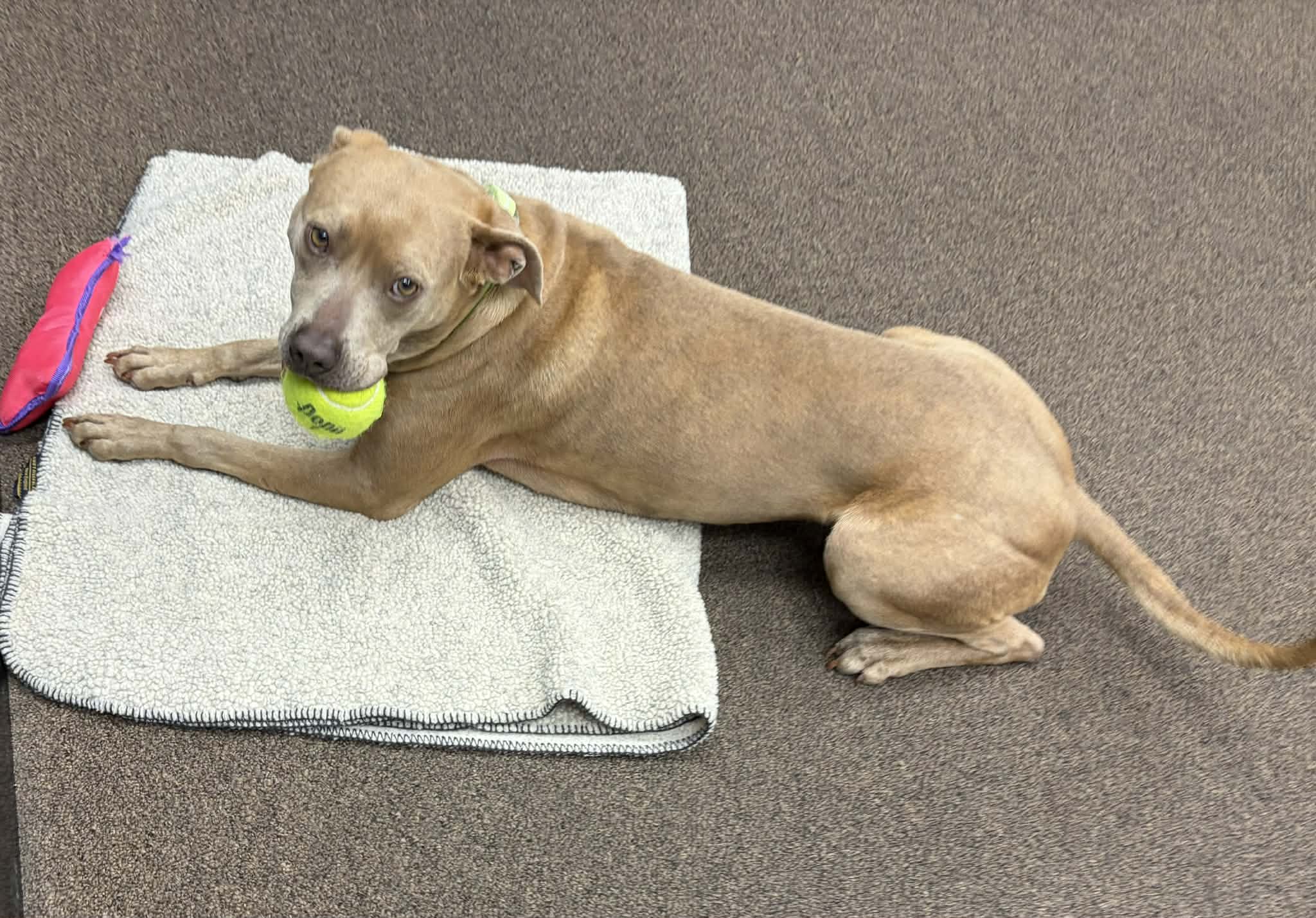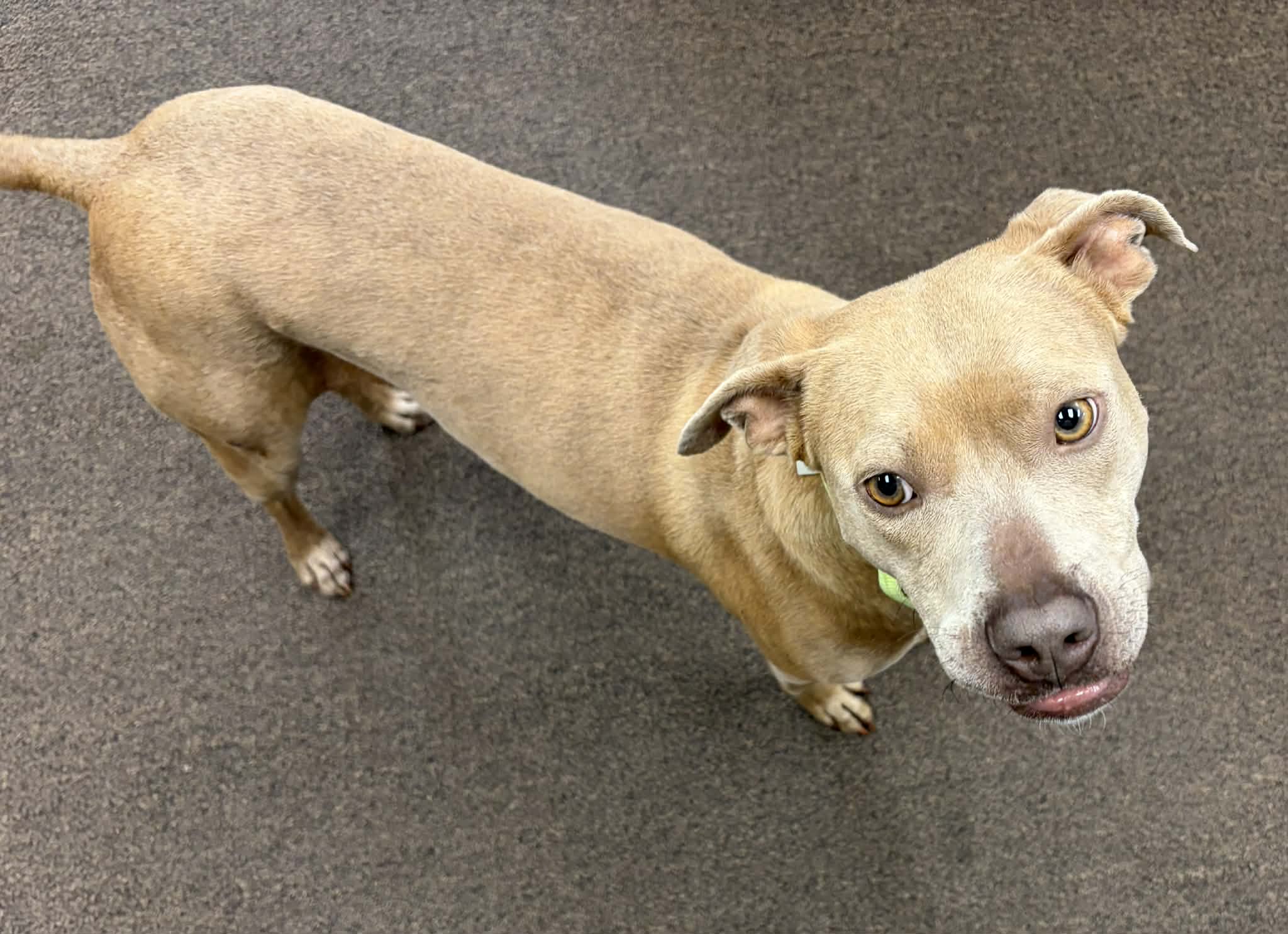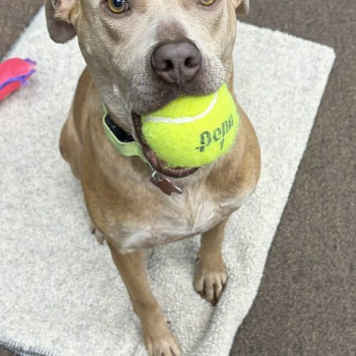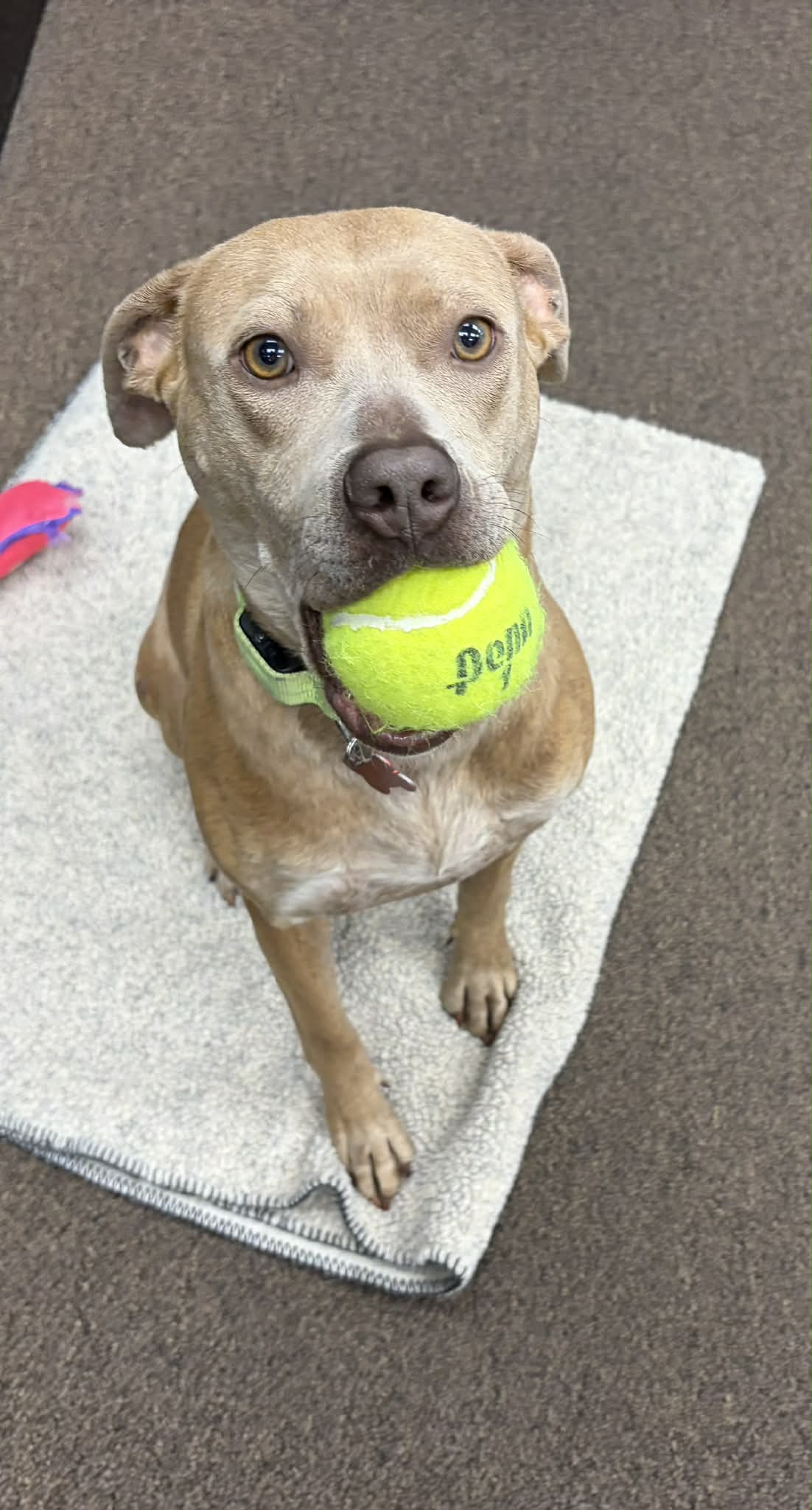 Audry is a 1 year old pitty (possibly boxer) mix that weighs approx 40 lbs. She is spayed and up to date on all preventatives. She is a friendly, happy, playful girl that gets along great with other dogs. She’s sleeps quietly all night in her crate. She has had no bathroom accidents in her current fosters home. She does still show puppy antics like jumping up on you and chewing things that she shouldn’t, but swift correction and redirection is helping with training. Also like a puppy, she has energy to burn, a long walk or playful activities will reward you with snuggles and cuddles! She would be best suited with kids above 10…at least until the jumping is corrected! She walks really well on the leash, rides really well in the car and her favorite things in life are being with her humans, wagging that beautiful butt and licking, she’s a lovable, lively, likable, licking machine! Now that the formalities are out of the way, can we talk about those eyes?! Stunning golden eyes that perfectly match her super soft golden coat! They suck you in! And how bout that bottom lip! The perfect pouty lip that melts your heart. She’s a beauty!