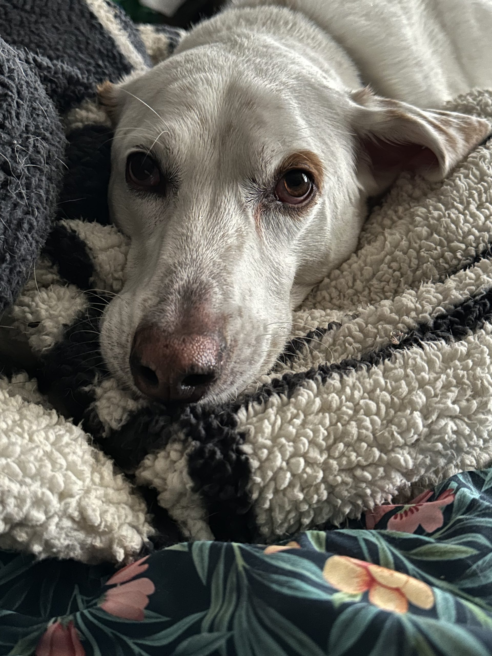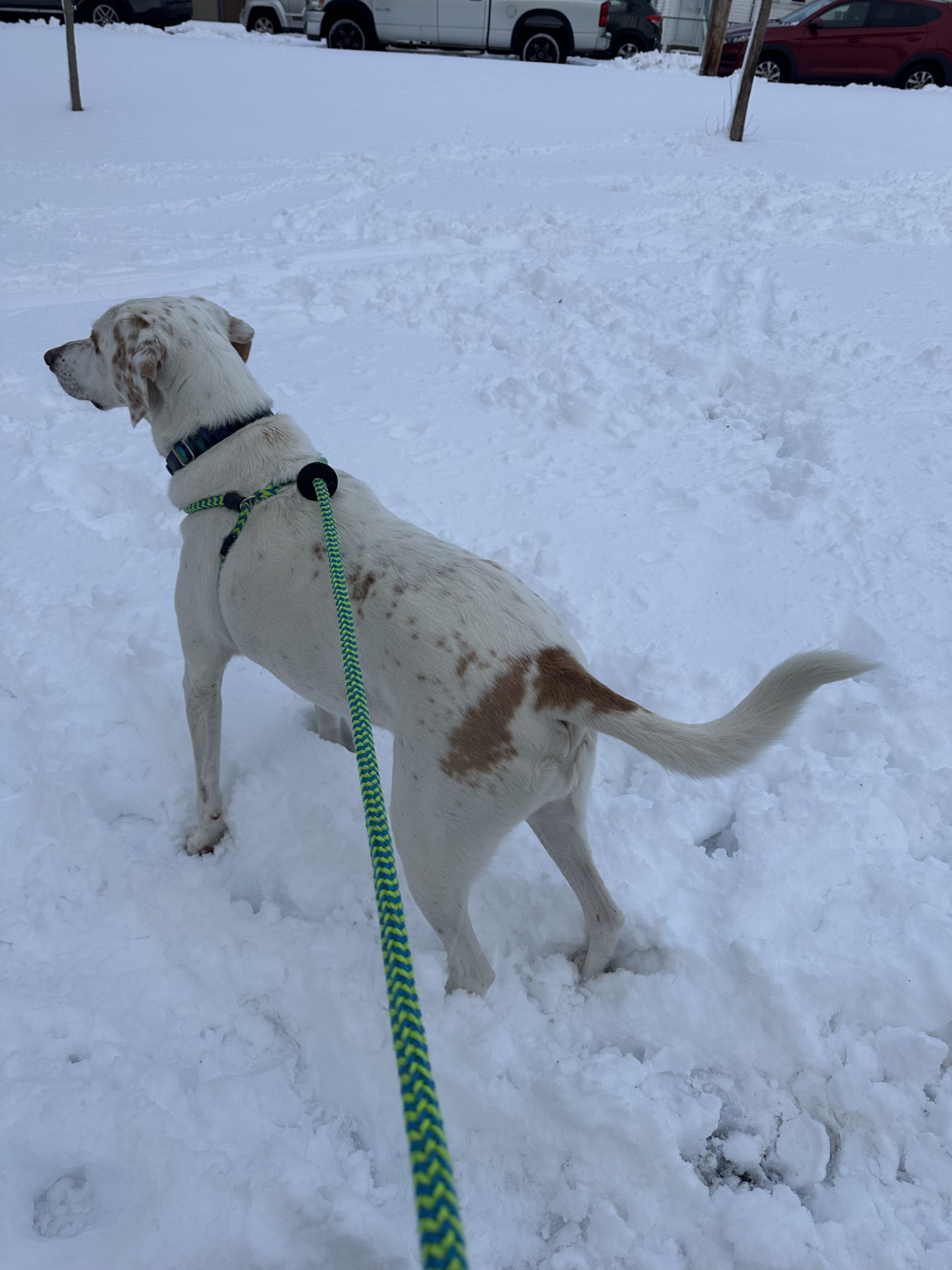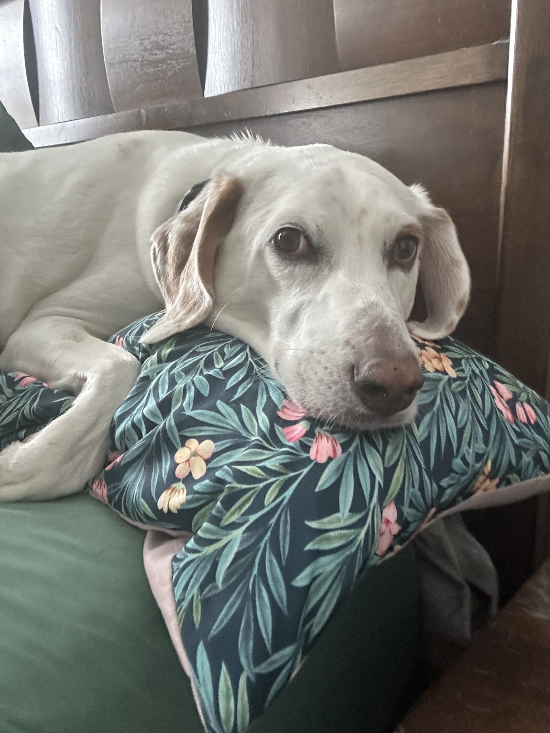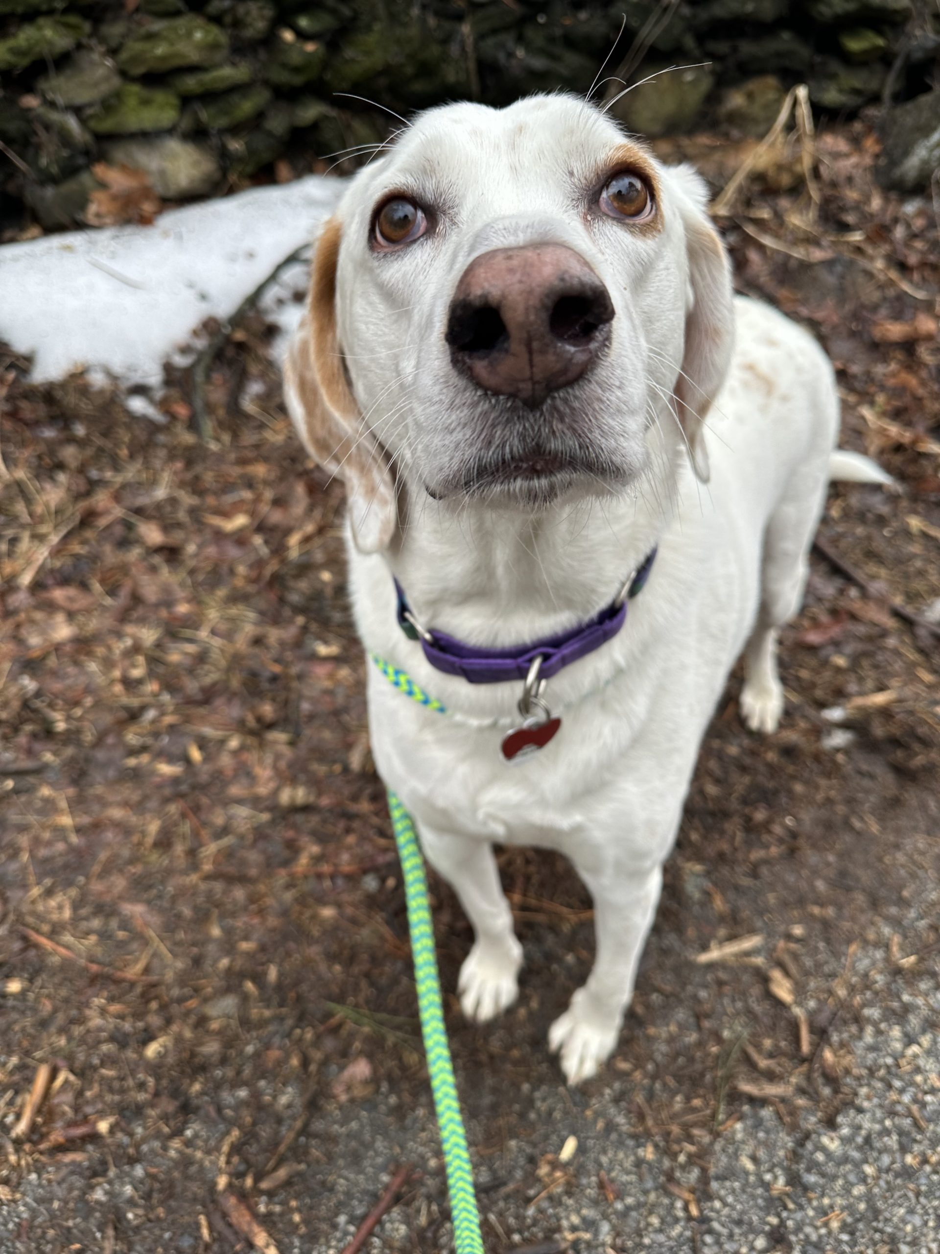 Doc is a typical hound on leash. His nose is always to the ground and he loves taking in all the smells so he can be a bit zig-zaggy on walks as he follows his nose but doesn't pull too much. Doc has been getting extra walks as a part of his fitness journey and he is always game to go out for more. Once he's had his walks he is low key inside and will happily snooze next to his people or with his dog friends or hunker down to binge watch Heated Rivalry or whatever your favorite show is. He is also a great work from home buddy!