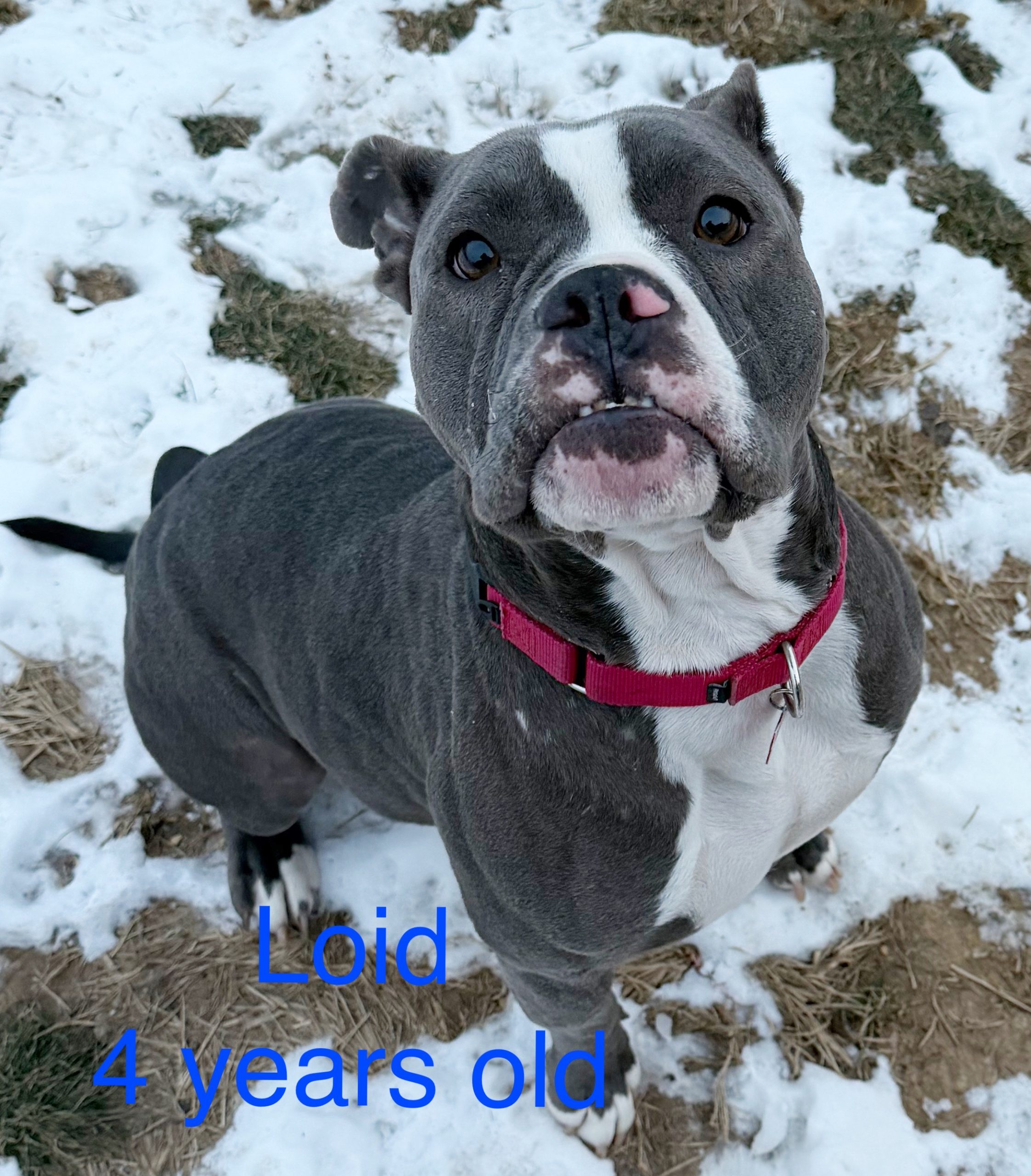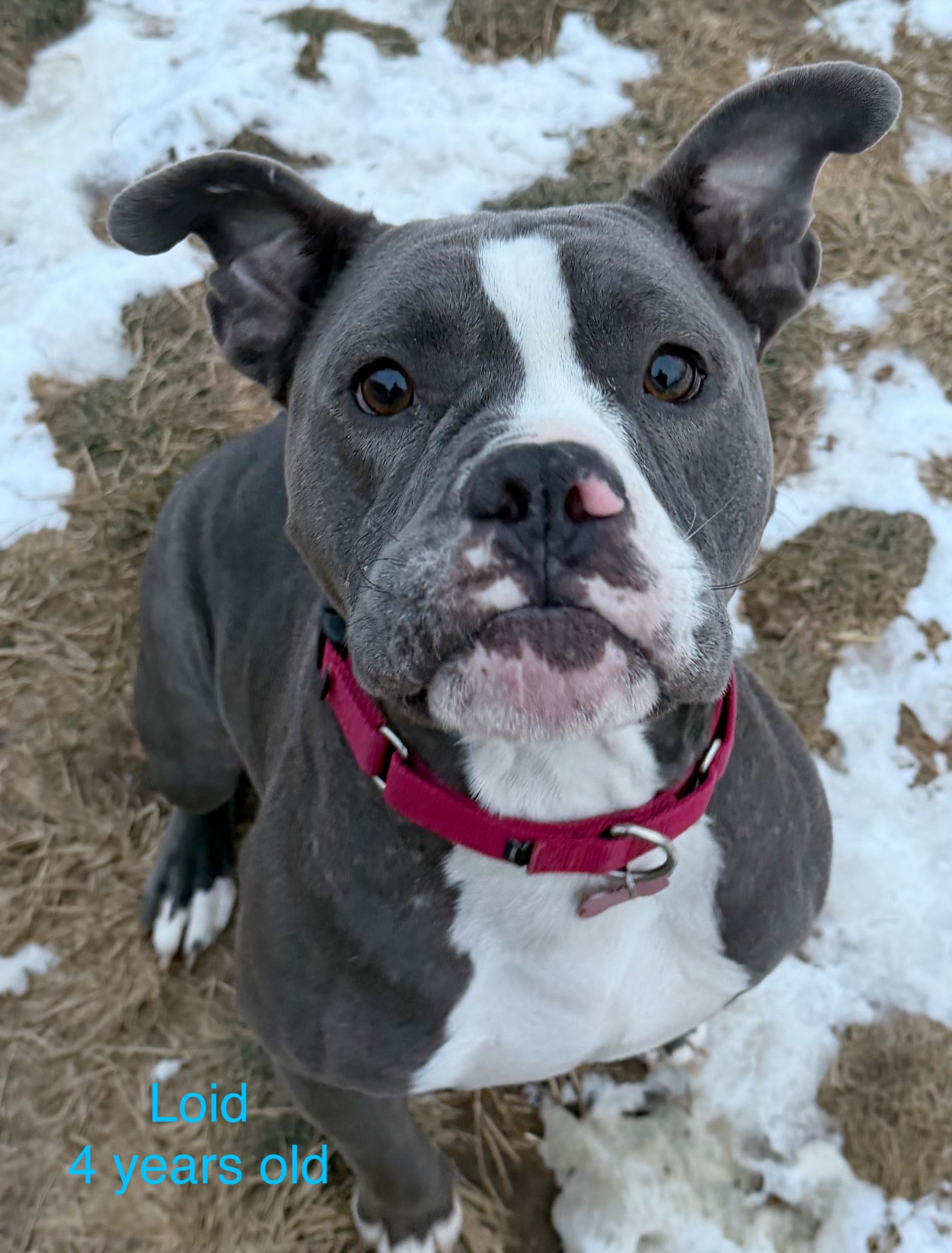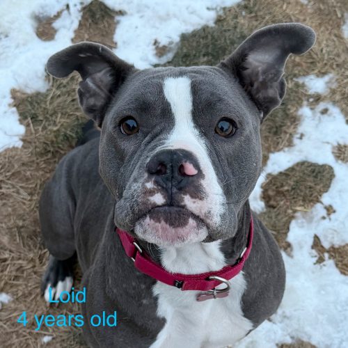 Loid is a neutered male, estimated to be around 4 years old, and believed to be a pit mix with a striking handsome gray and white coat. He came to us from a shelter in South Carolina, and while his past wasn’t always kind, Loid carries his story with quiet strength. He does have a few scars from his rough start, but they do not define him — they simply remind us how far he’s come. What defines Loid now is his sweetness, his trust, and the bright future waiting ahead of him.