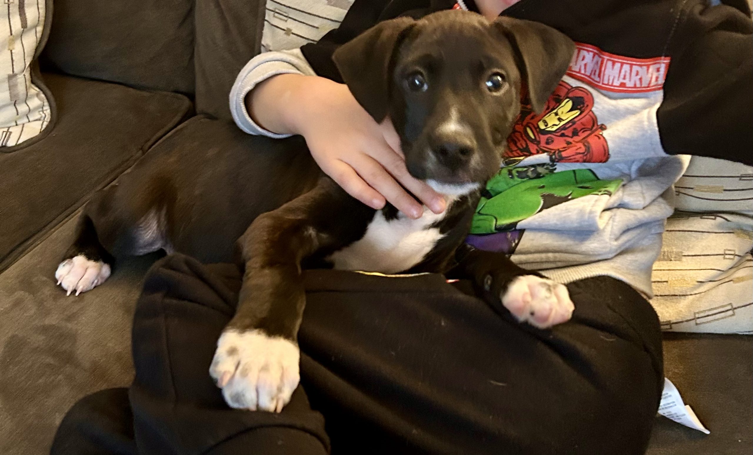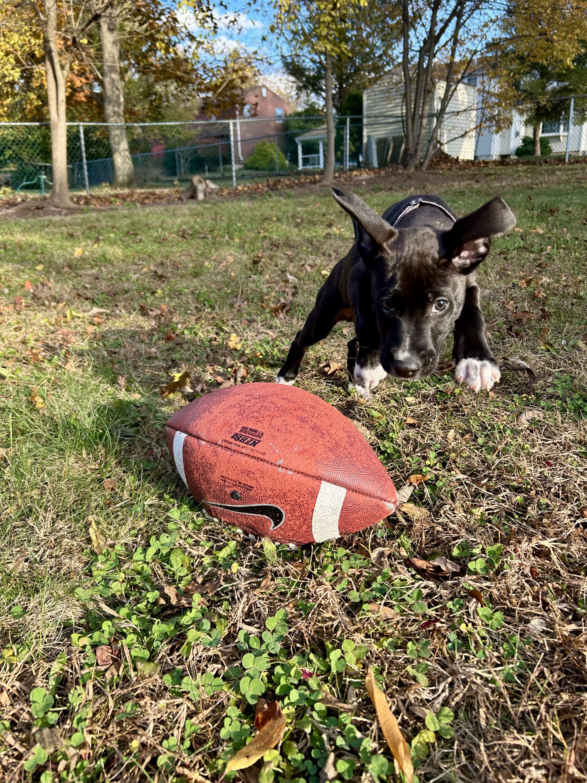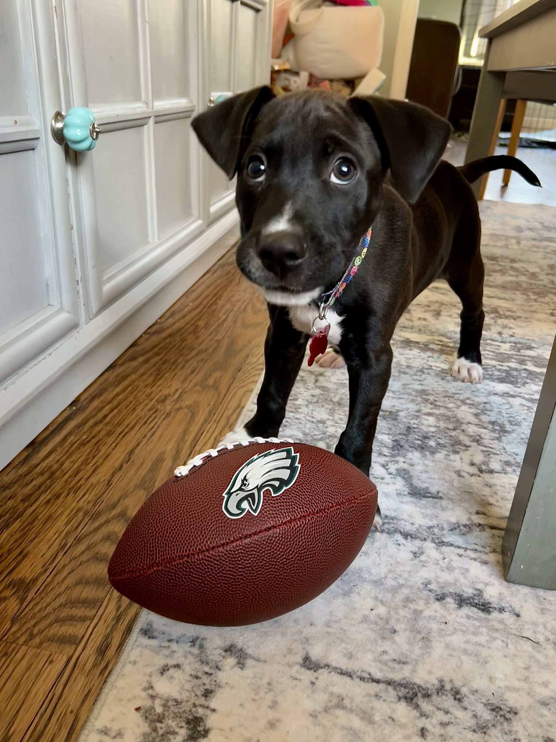 Football is training to join the Eagles next season! His skills in keep-away when playing with his sister should help! He is a typical puppy: he loves to run and play, eat, and sleep. He is working on house training, and he and his sister keep the crate clean for a stretch of a few hours. Give this boy a chew toy and a lap to snuggle on and he'll be your new best friend!