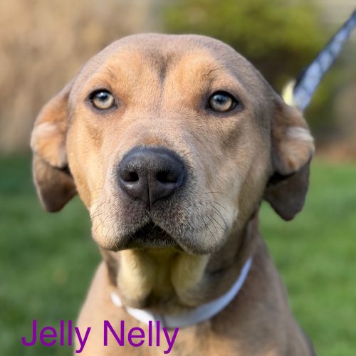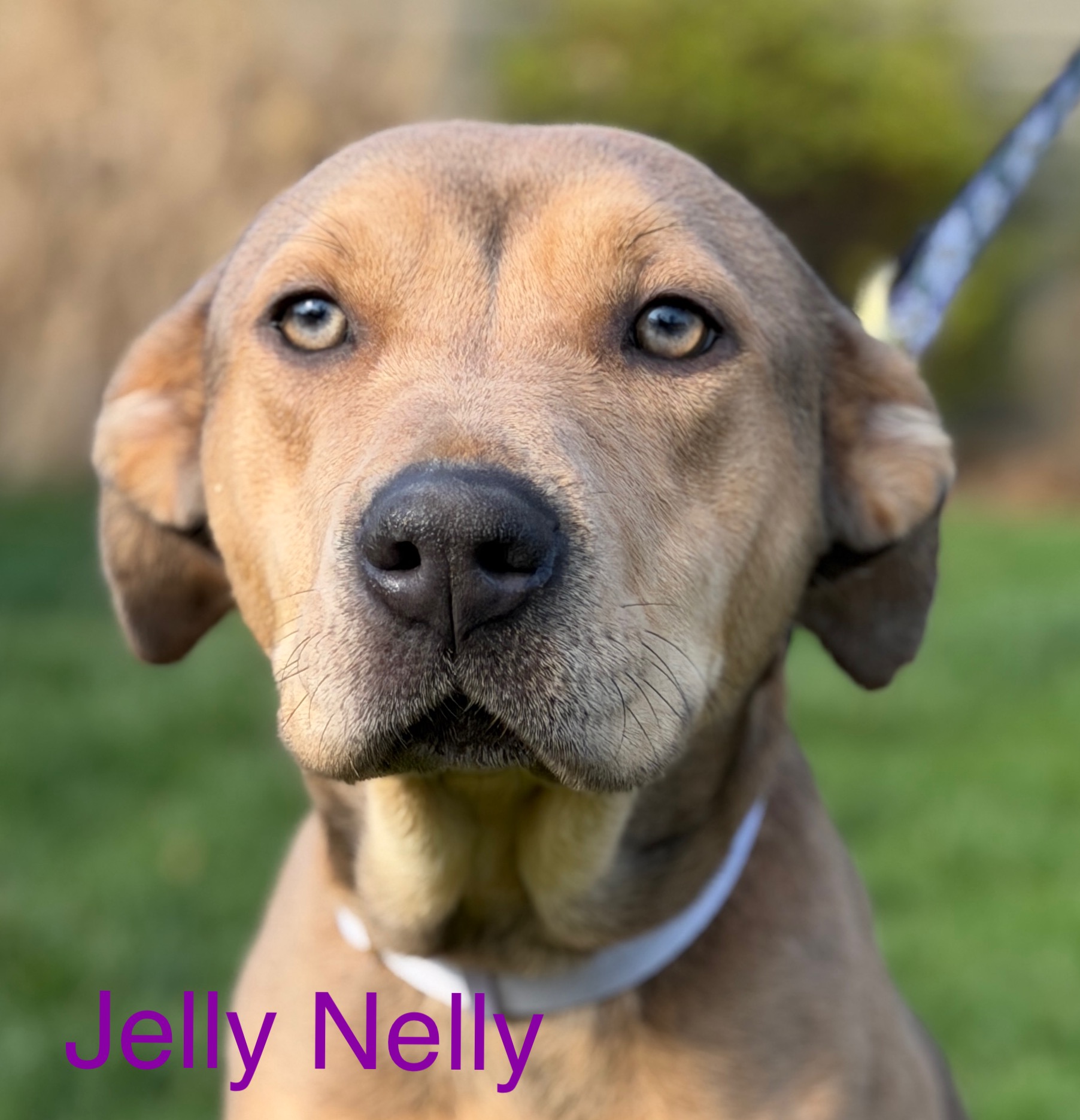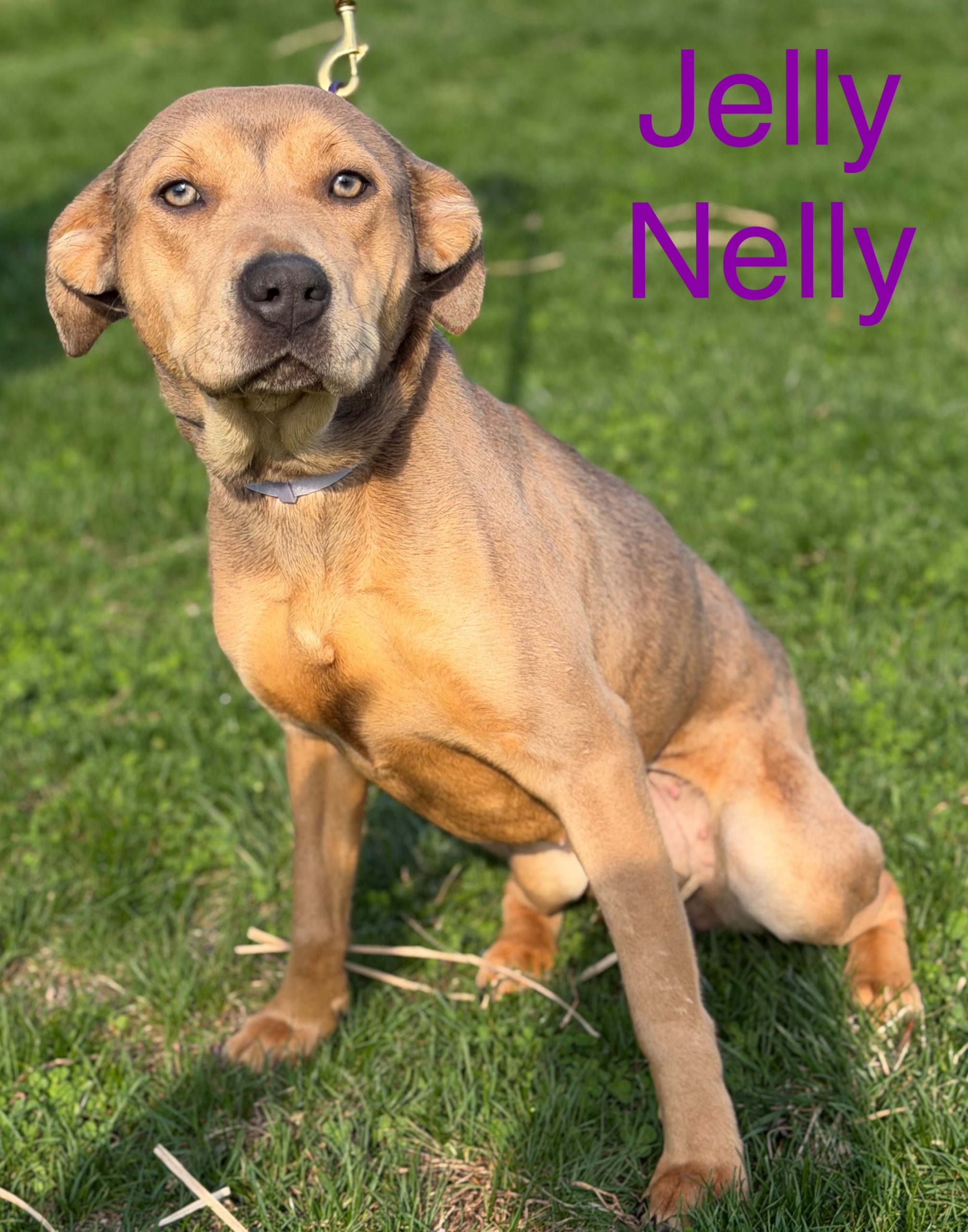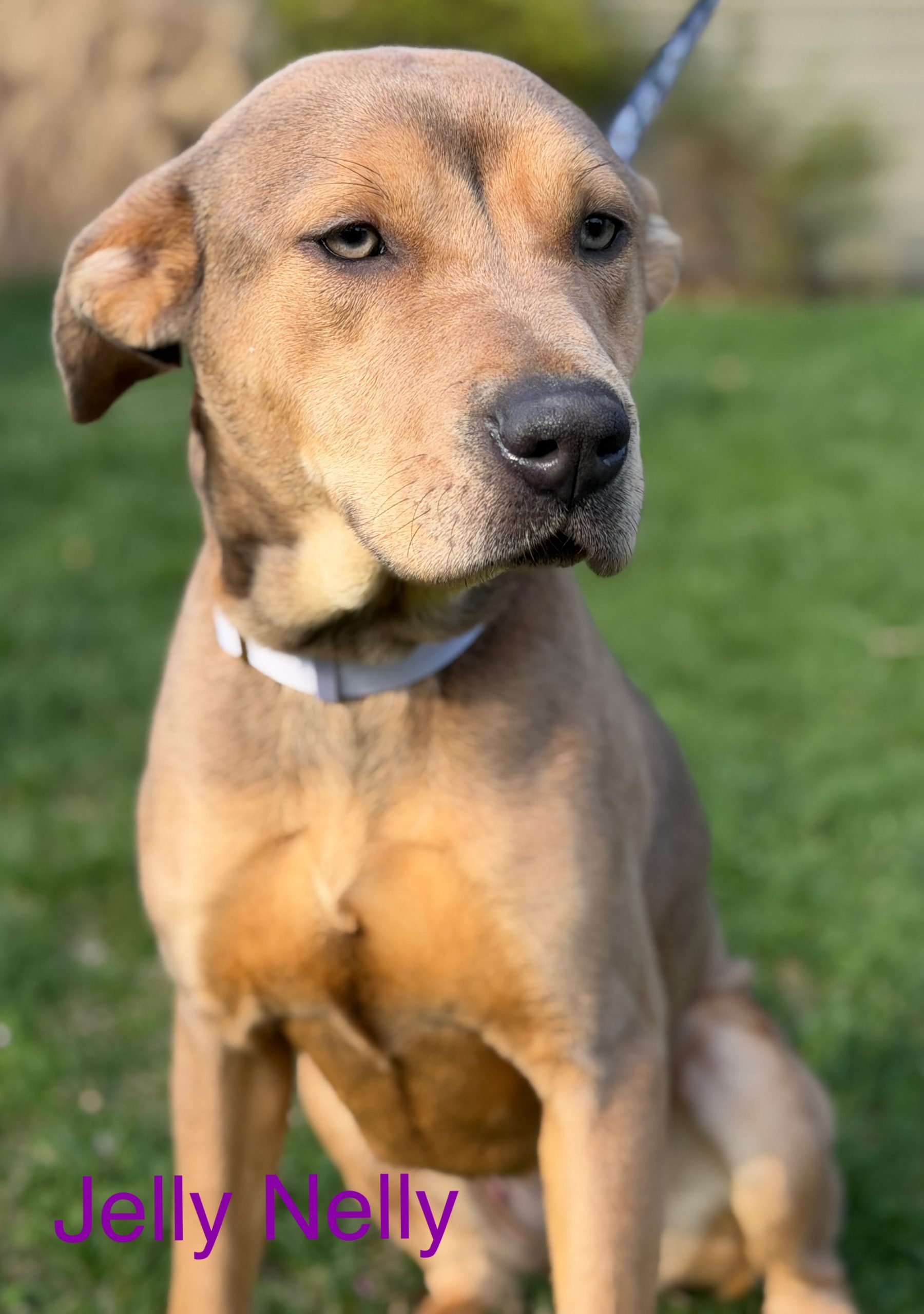 Jelly Nelly is the kind of pup who makes the world slow down for a moment—just long enough for you to fall completely in love. This beautiful girl, a lab/pit mix with soft brown brindle splashes across her coat, has a gentle presence and a sweetness that feels almost magical.
