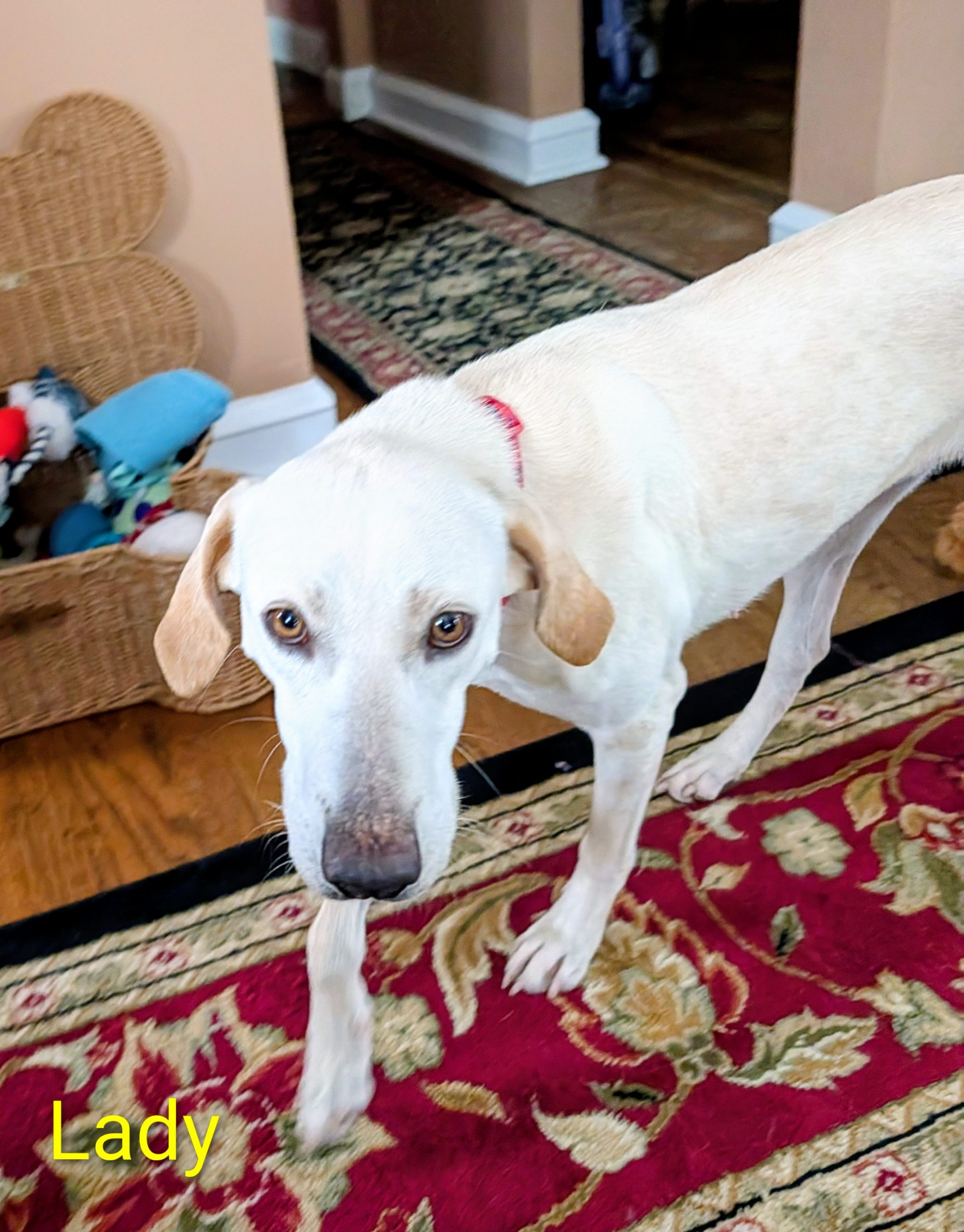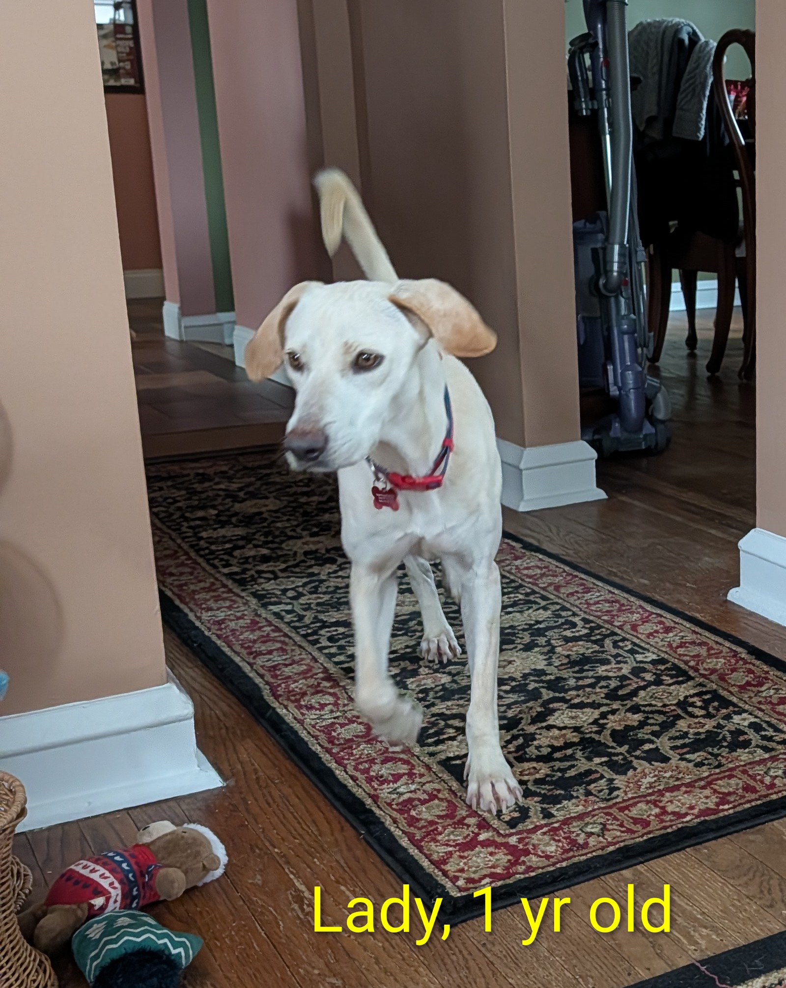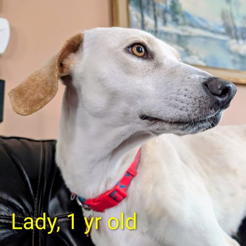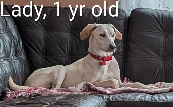 Meet Lady, a delightful 1-year-old yellow lab mix who weighs 42 lbs. This tall, energetic girl is full of joy and loves to play. She's incredibly affectionate and always wants to be around her people. Lady has a passion for toys and enjoys games of fetch and tug-of-war. After some active playtime, she's more than happy to settle down for a cuddle or a nap. Lady is good with dogs, cats, and kids, though she benefits from slow introductions. Due to her size and playful nature, she would be best suited for older children. She would thrive in a household with another playful dog. Training Lady is a breeze since she's highly food-motivated and eager to please. She enjoys car rides and walks, greeting everyone she meets with enthusiasm. Lady is crate-trained in her foster home and is making great progress with house-training. She's ready to bring love and energy to her forever home. Lady will be available for adoption starting March 1st.