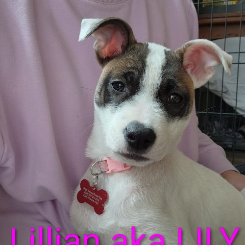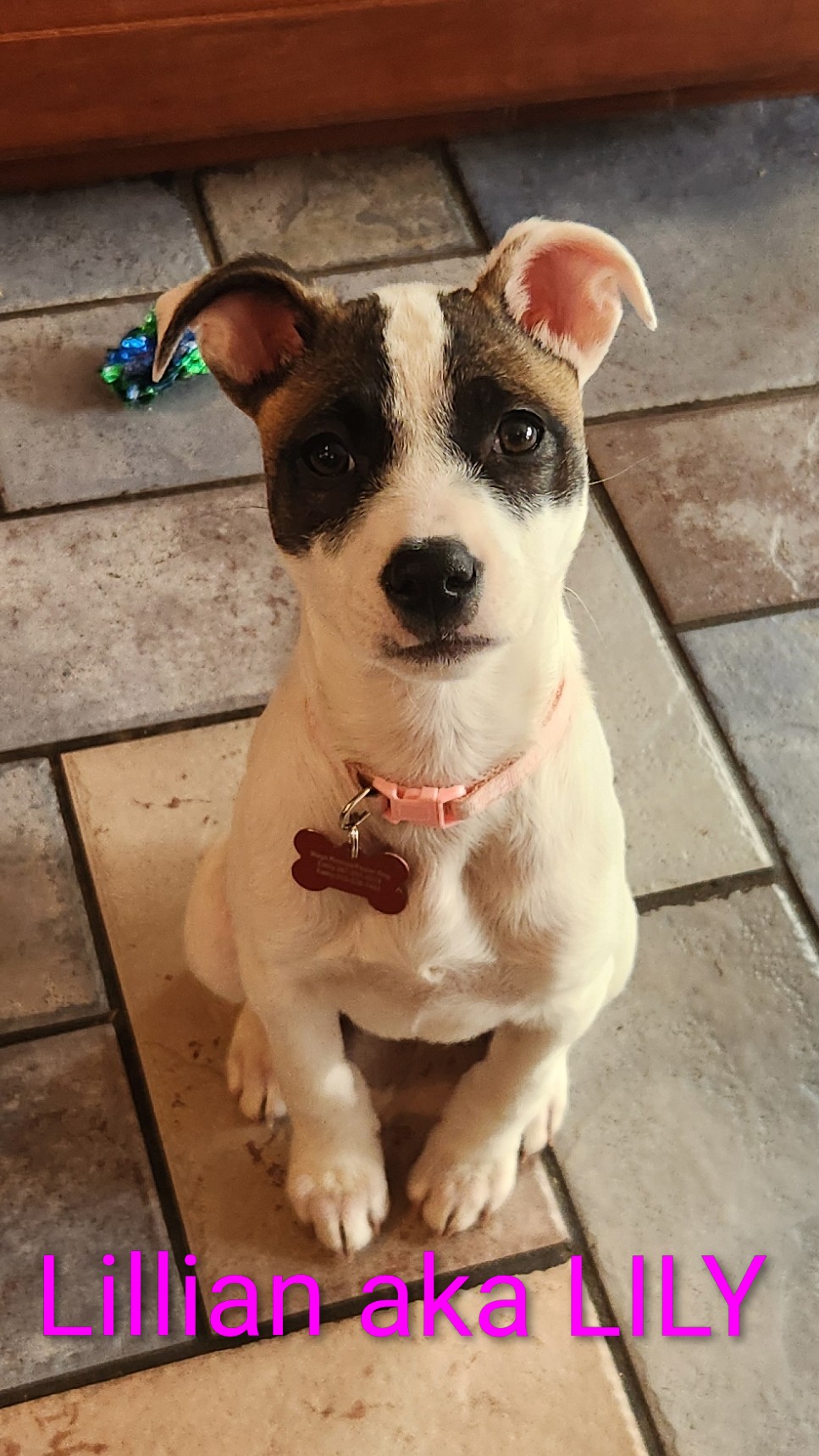 Lillian is a real character! You can't help but to smile at her perky personality. Lily is curious, energetic and expressive. She is a slender girl with adorable floppy ears. Lillian loves to work on "sit" and naturally attends to whoever is training her. She is eager to please and responsive to her foster parents. Lily is working on potty training catching on more and more each day. She is a fast runner and loves to chase and be chased by her little foster doggie sister. As much as Lily enjoys rambunctious play time and wrestling with her sis, she is also very loving towards her. Lily will add a lot of positive fun energy to any home!