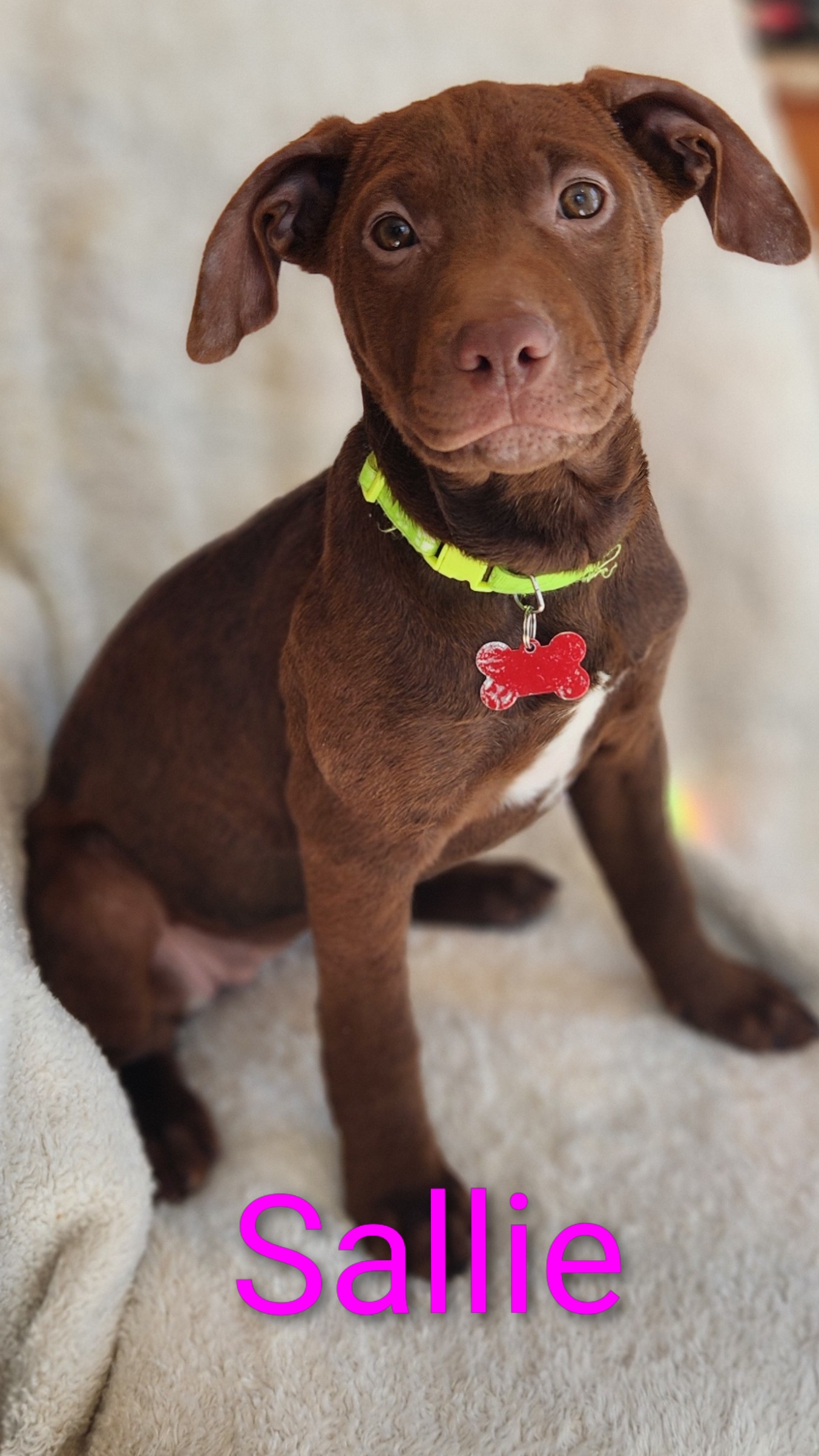 Sallie: Sallie is so much fun! If there is action, Sallie probably started it or is at least in the middle of it. Sallie instigates play often, is energetic and almost always has a toy in her mouth. She is as playful as she is sweet. Sallie loves people and would probably do well in an active family. Sallie is a happy, happy little girl! As bubbly as she is, she loves lap time and cuddling up for a snooze.