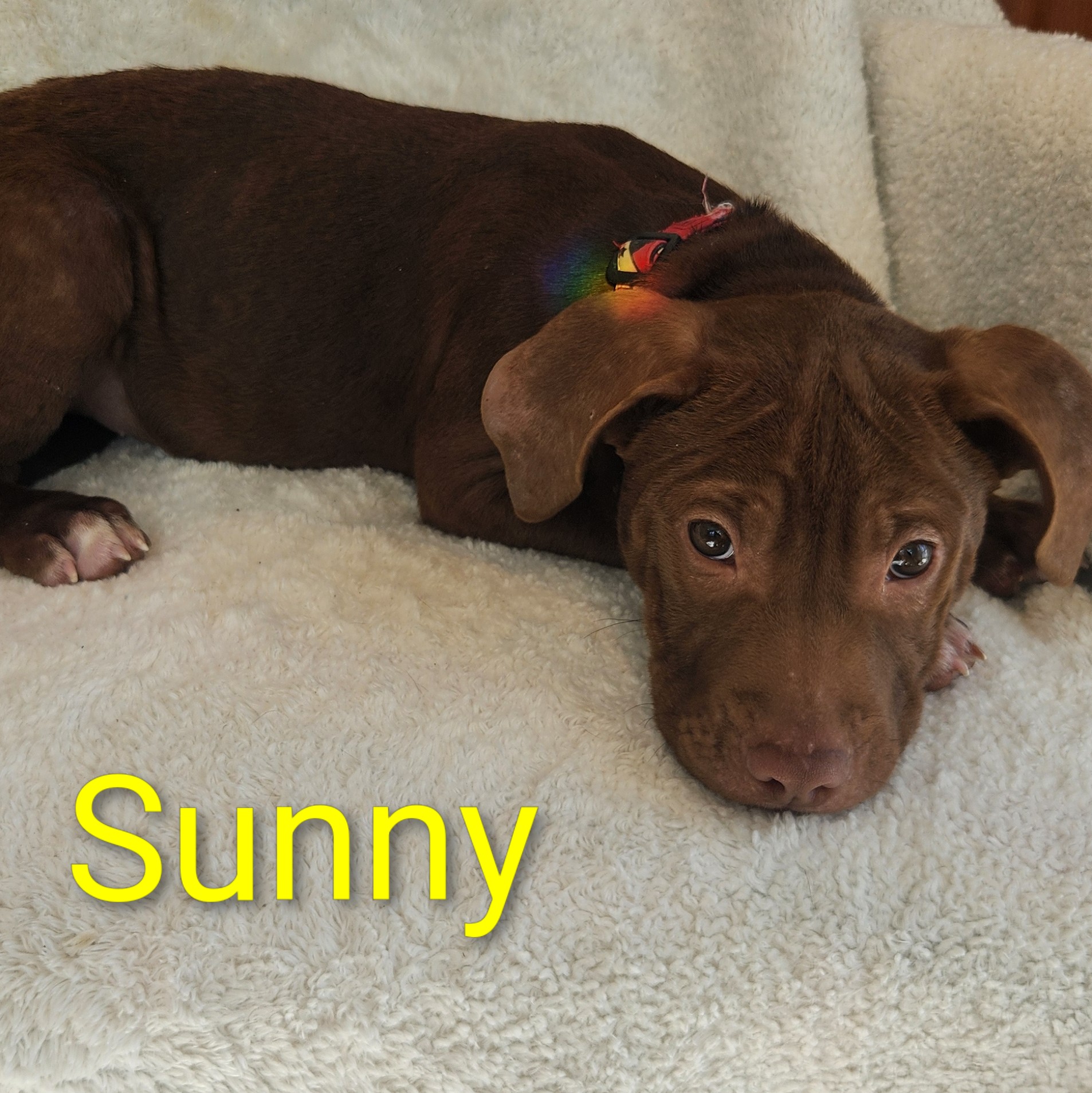 Sunny: Sunny is an independent boy. He plays well with his siblings and is content on his own as well. It isn't unusual to find him in the crate with a toy while his siblings are making a ruckus. Sunny can melt in a lap given the opportunity. He little more shy than a couple of his siblings but warms up fast.