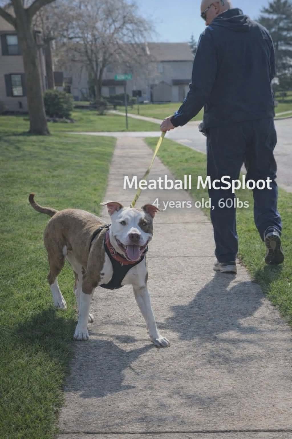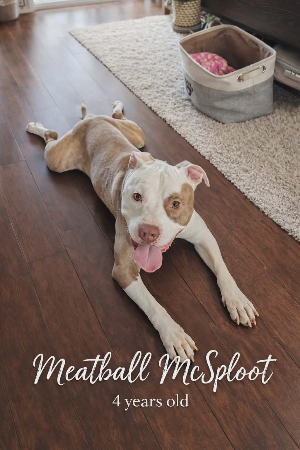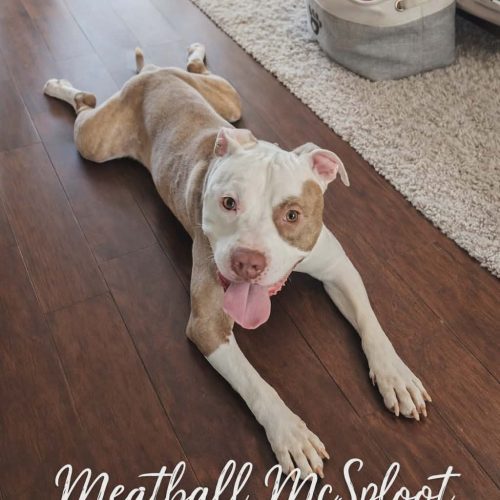 At the end of the day, Meatball McSploot is just a lovable, goofy, heart-melting dude who wants a home where he can be part of the family—whether that's playing, walking, or just flopping dramatically on the floor like the little legend he is.