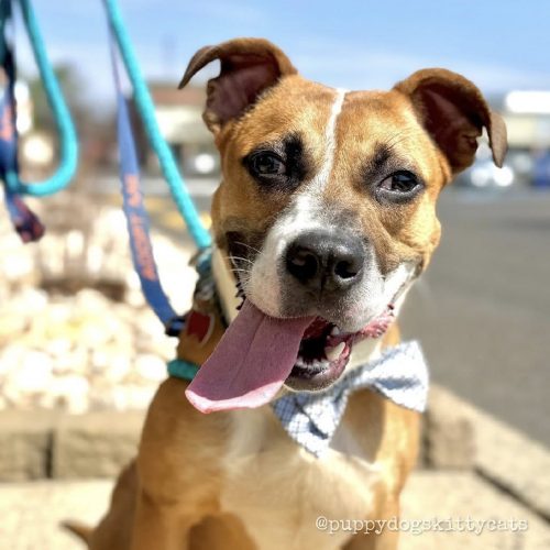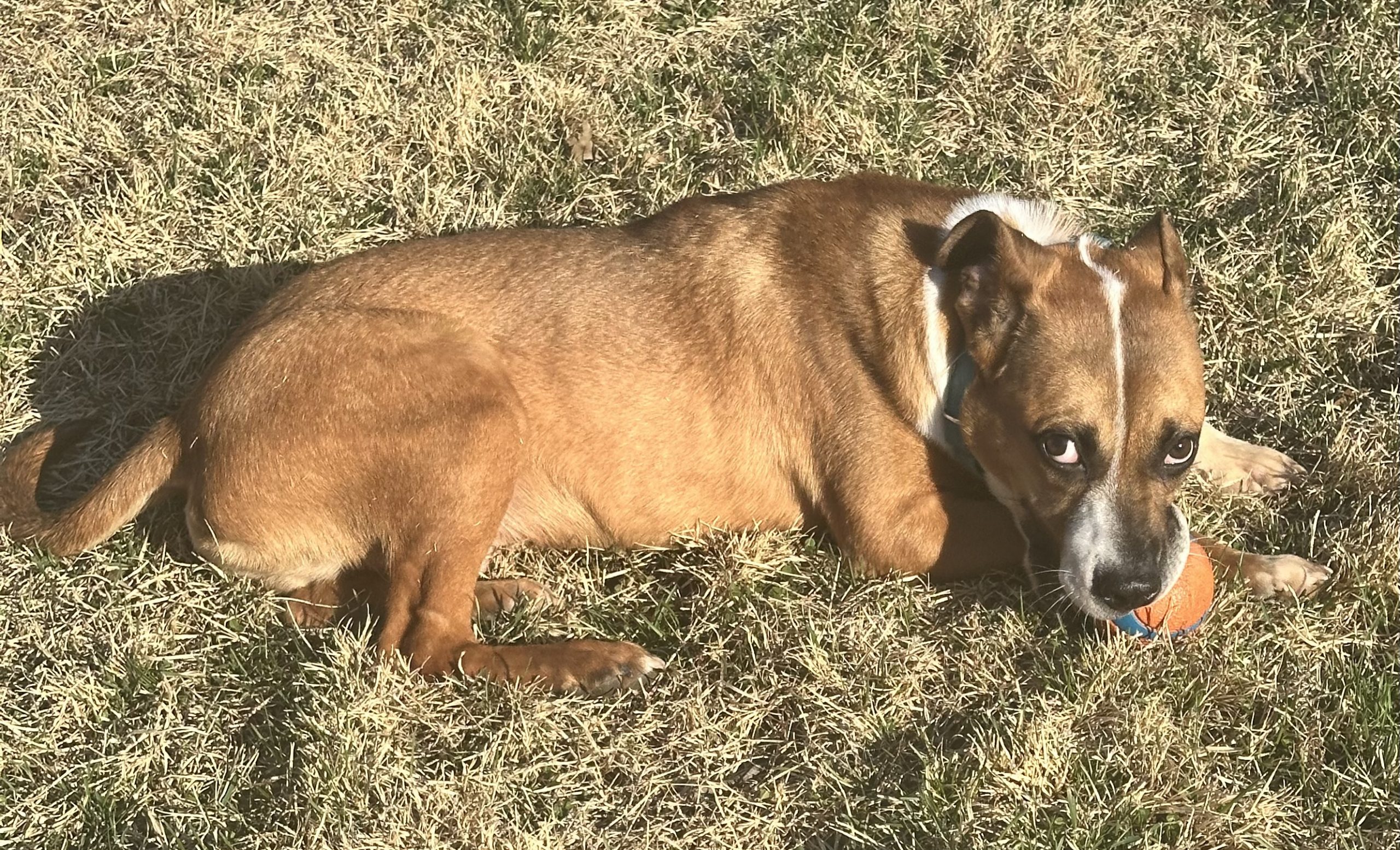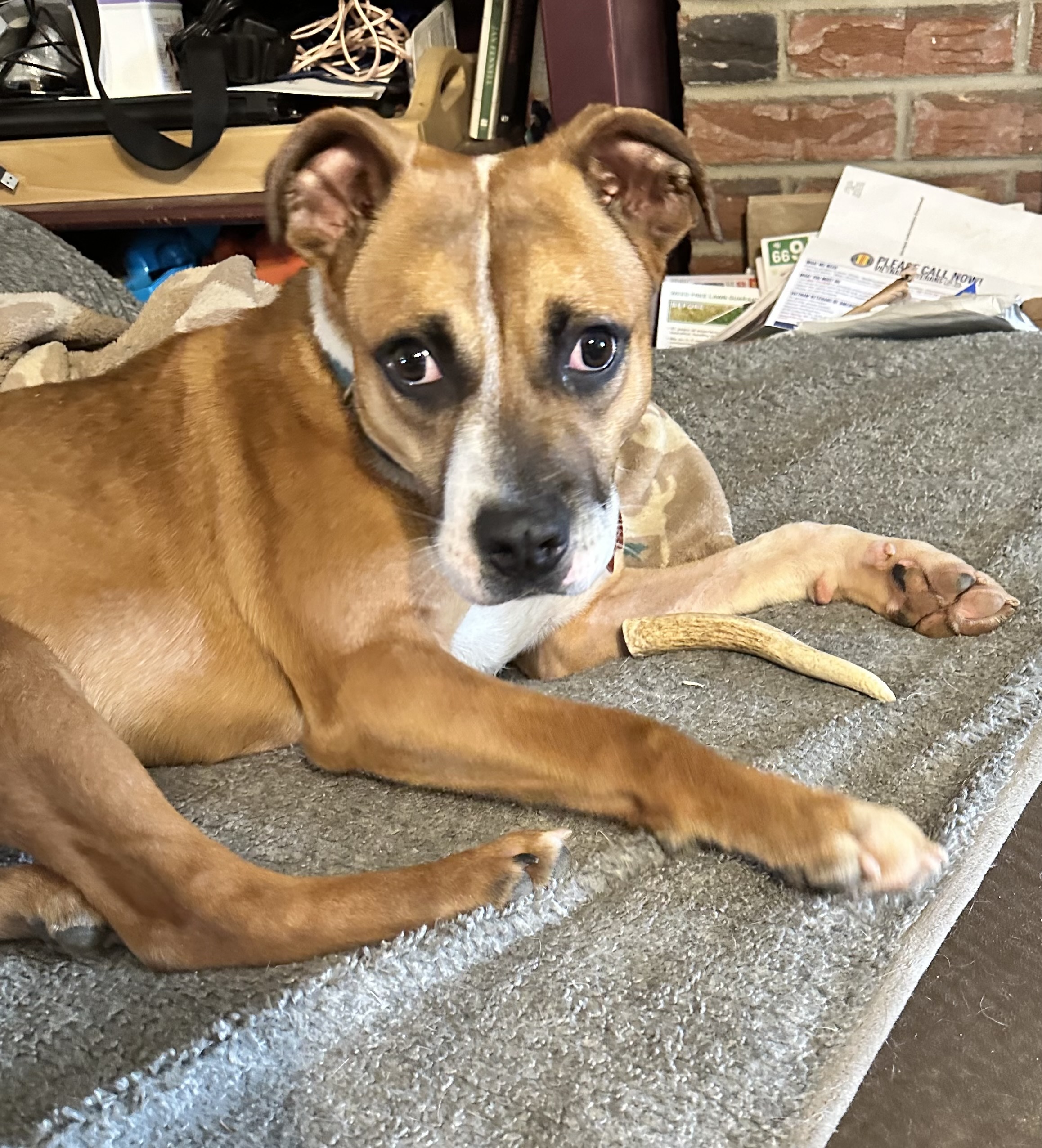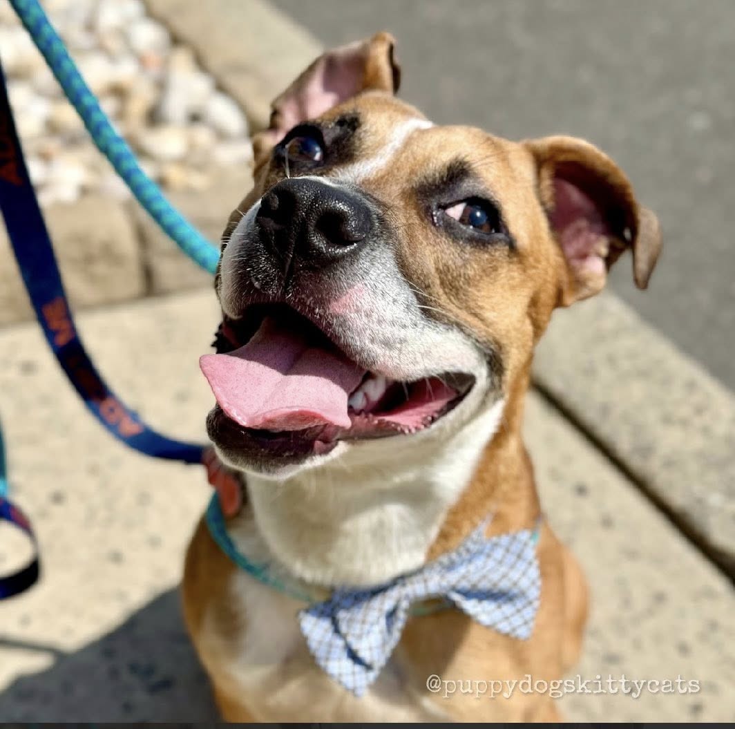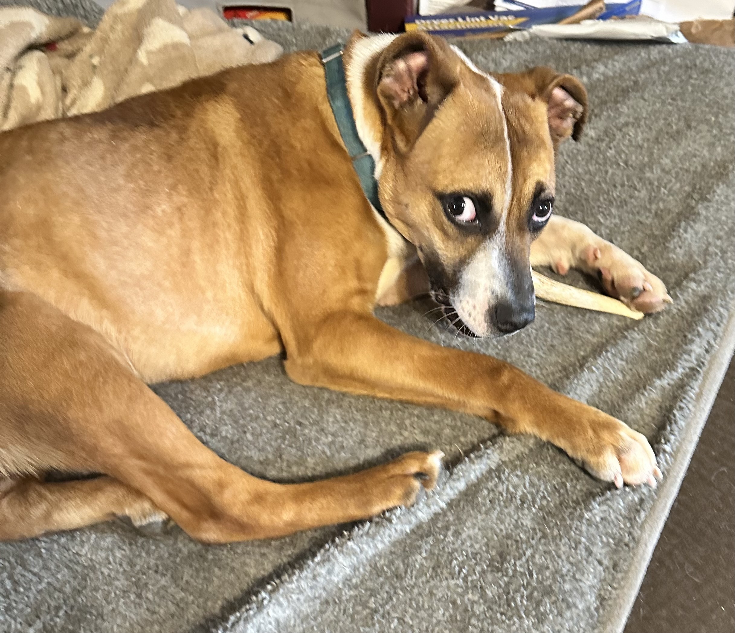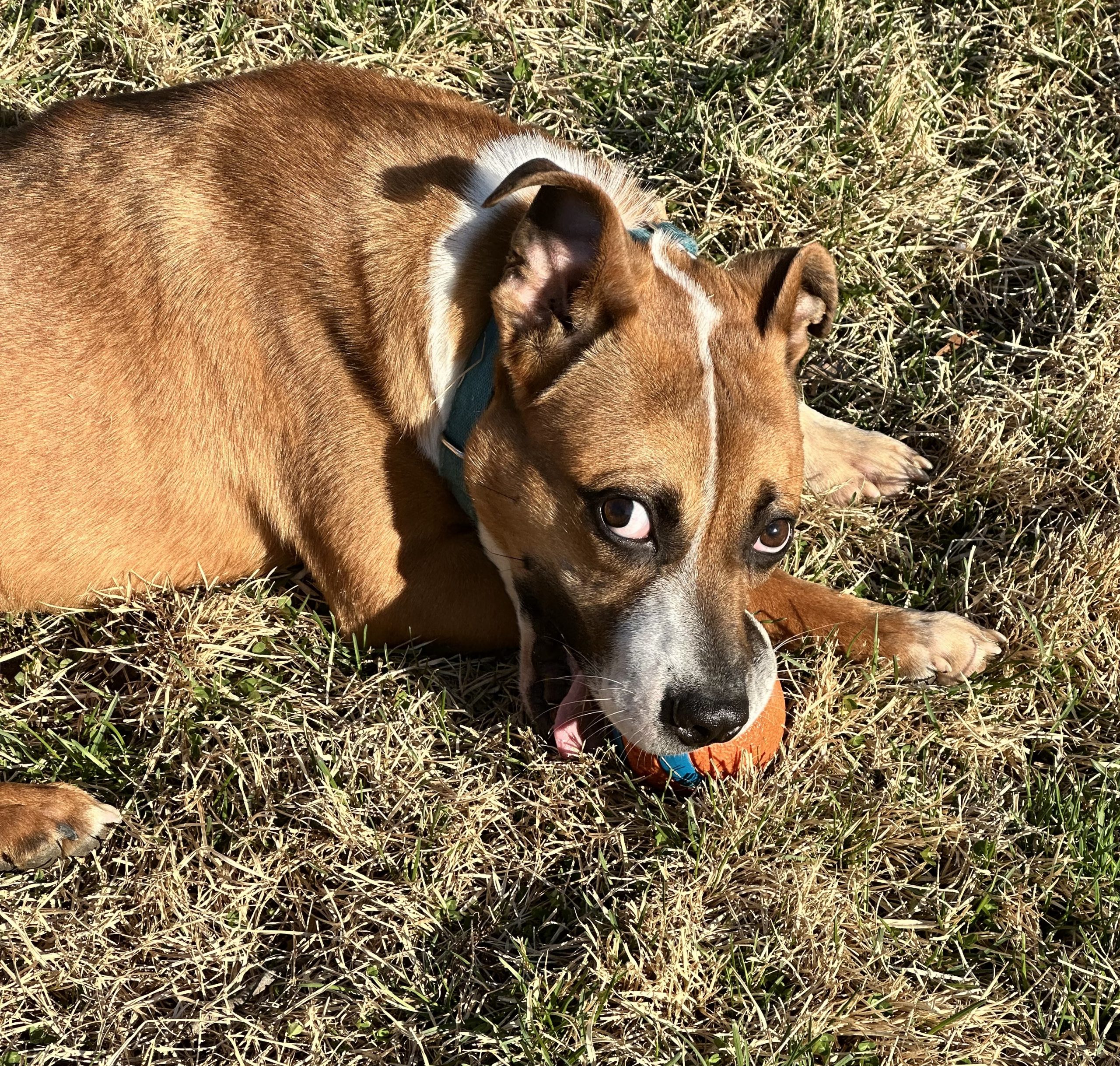 He loves toys and bones and will entertain himself throwing his toy around, chewing a bone or engage you in a game of fetch or tug. He makes the silliest grunting, snorting noises when he plays. He can be a little mouthy when playing, but we are working on redirecting to his toys or bones.