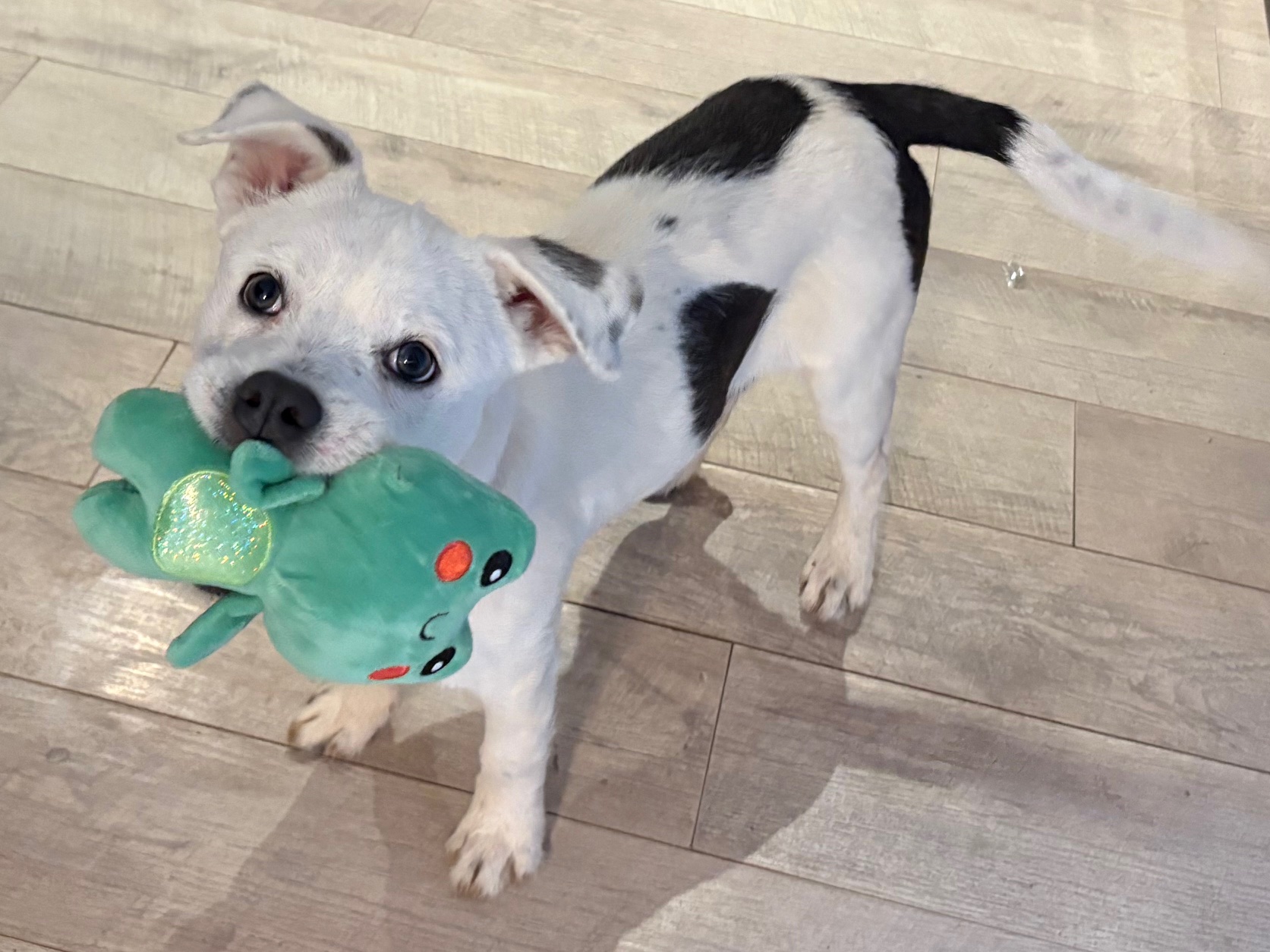 Mochi Donut loves everyone she meets, big and small. She plays great with other dogs and loves a good squeaky toy, especially the kind she can proudly parade around like a trophy.
