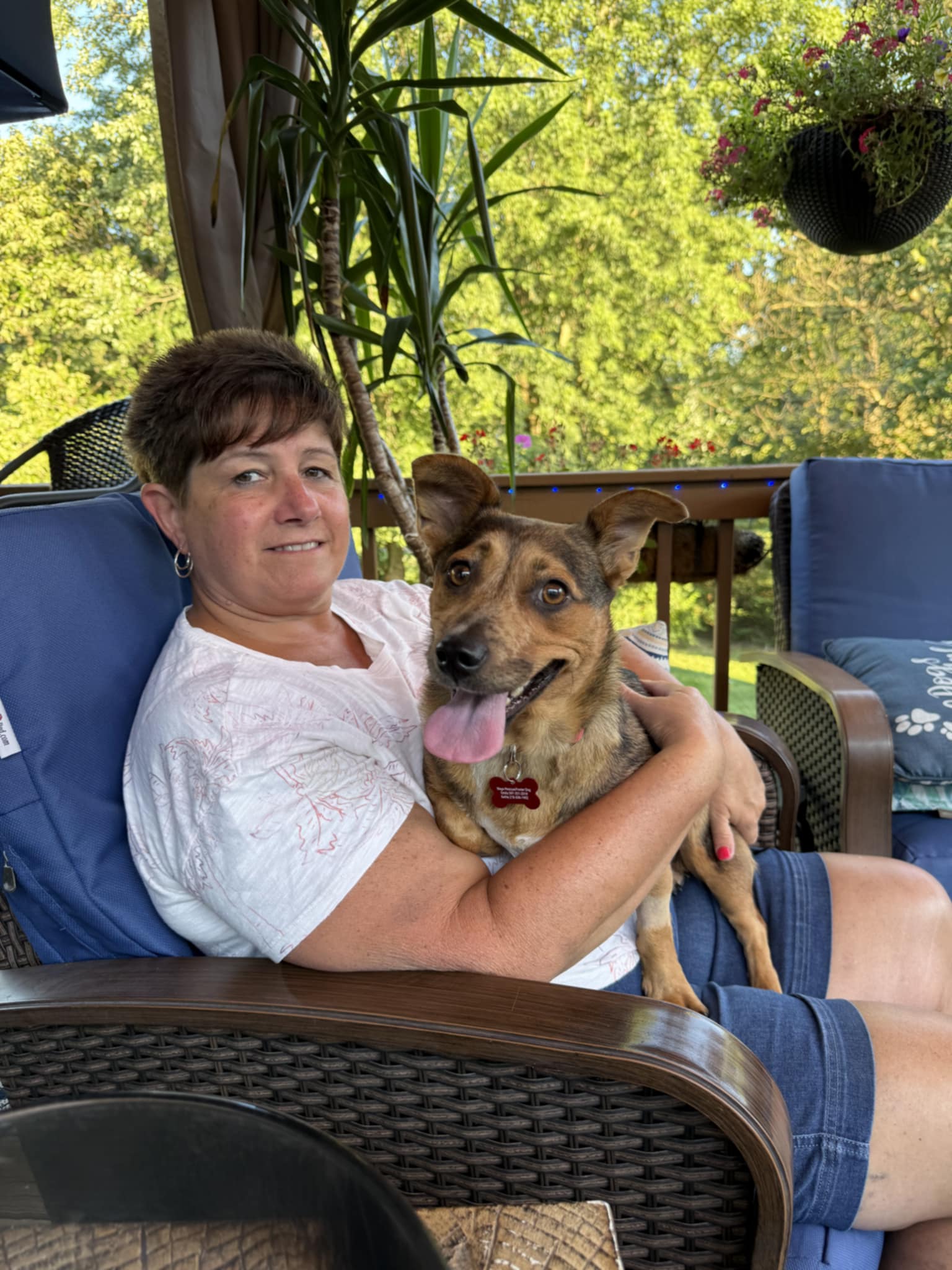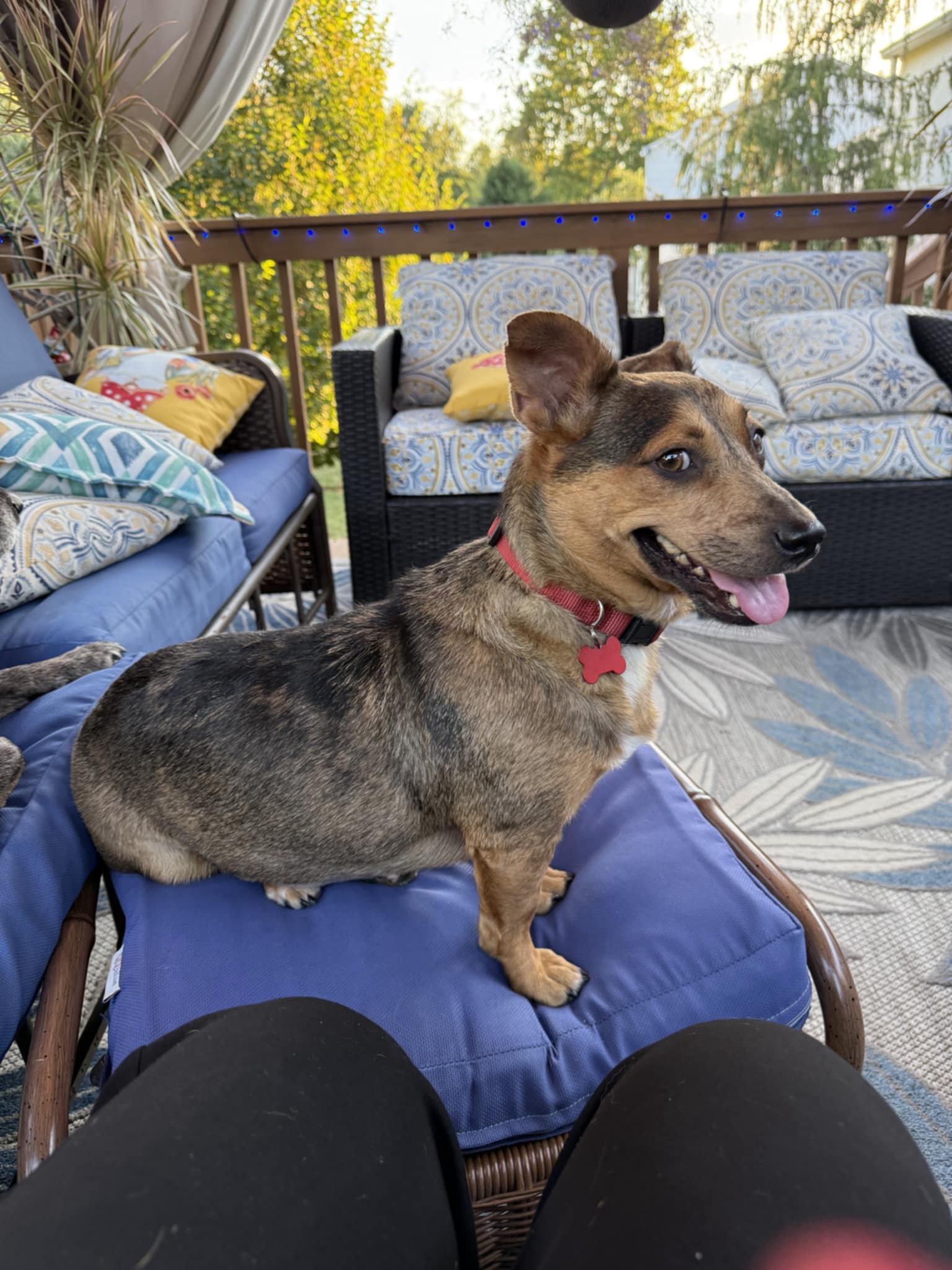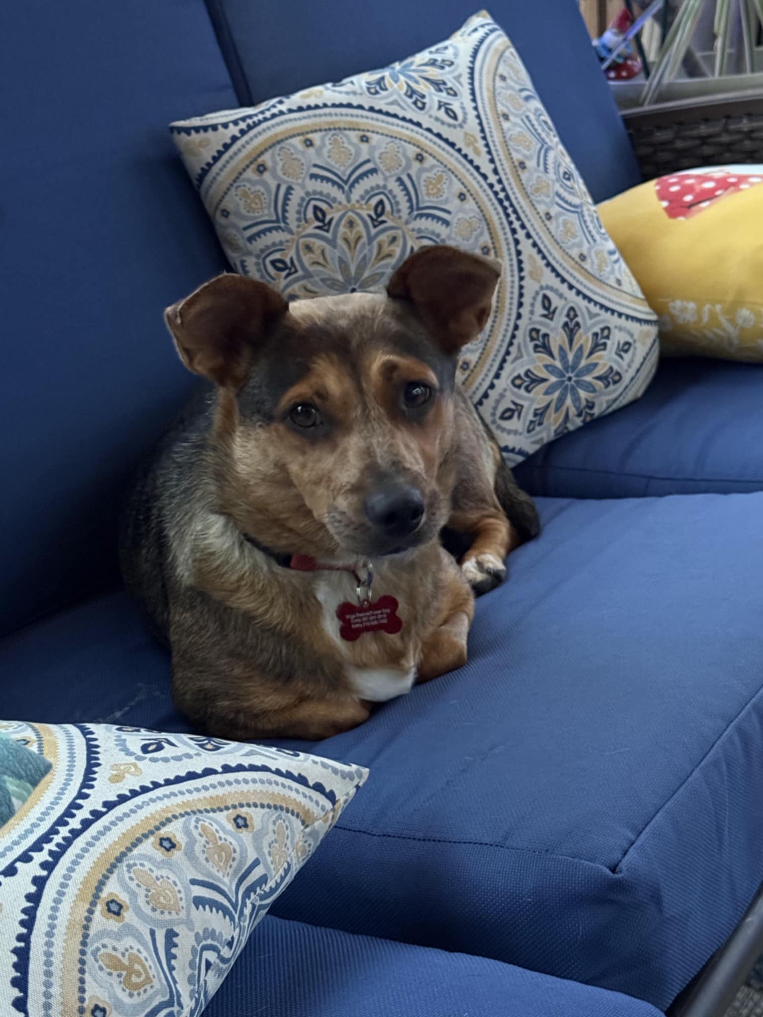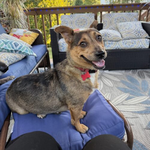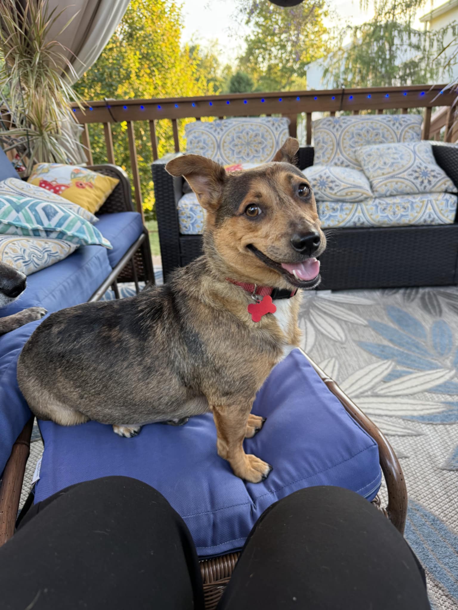 Peanut butter cup is a 2 year old Corgi/ doxie mix from NC. She is spayed, HW-, house and crate trained