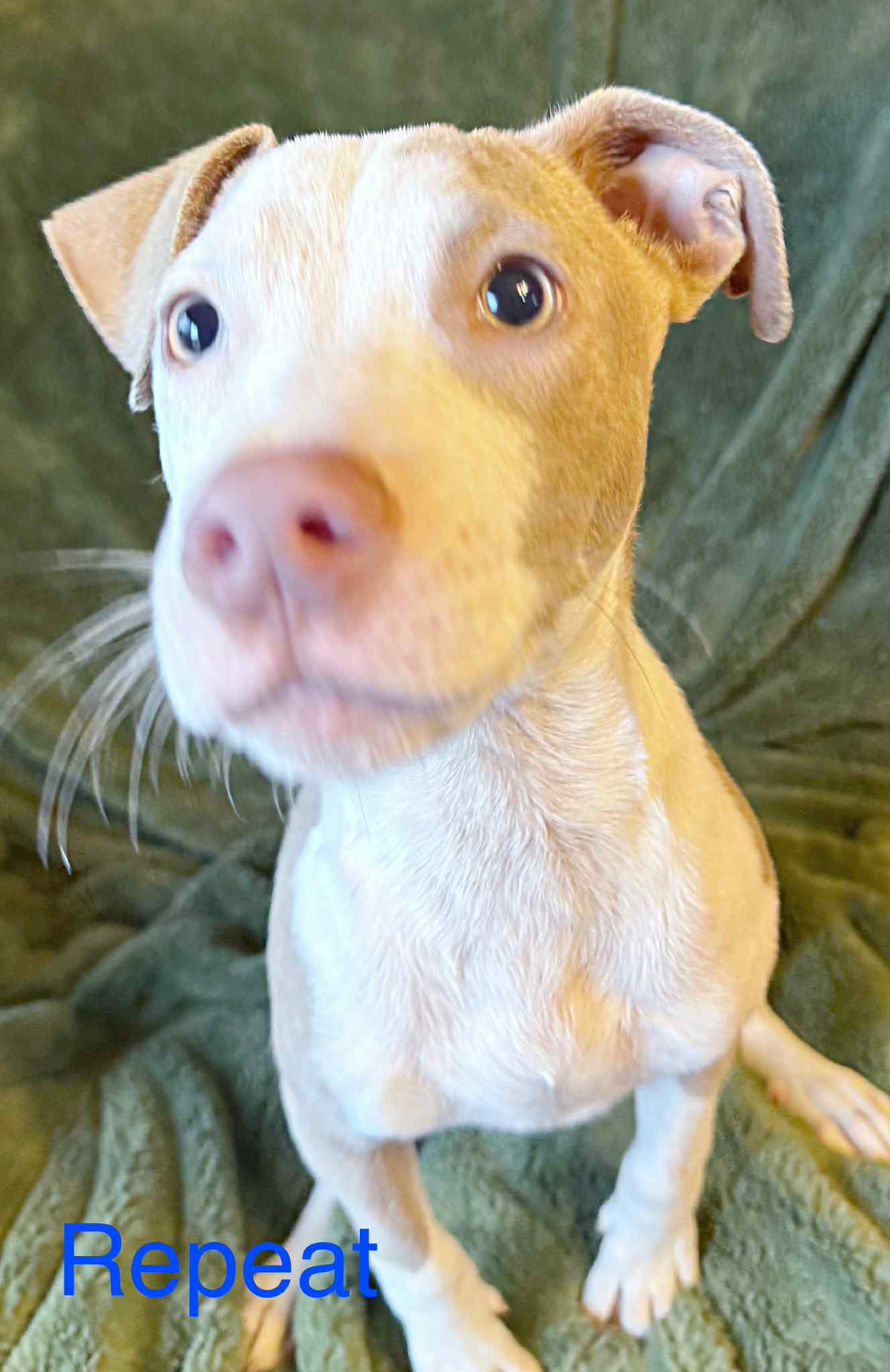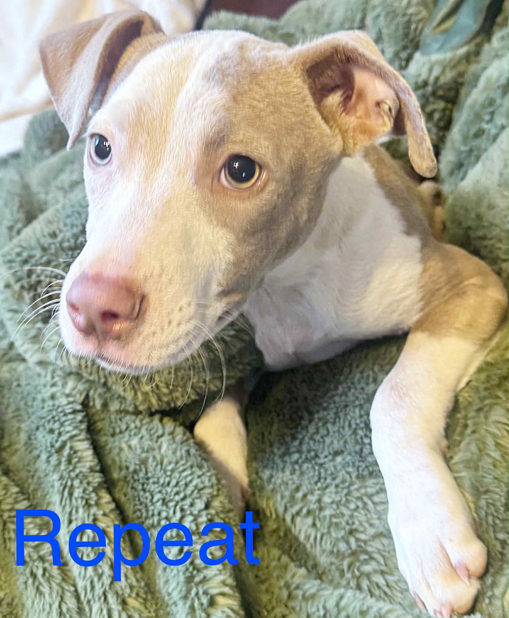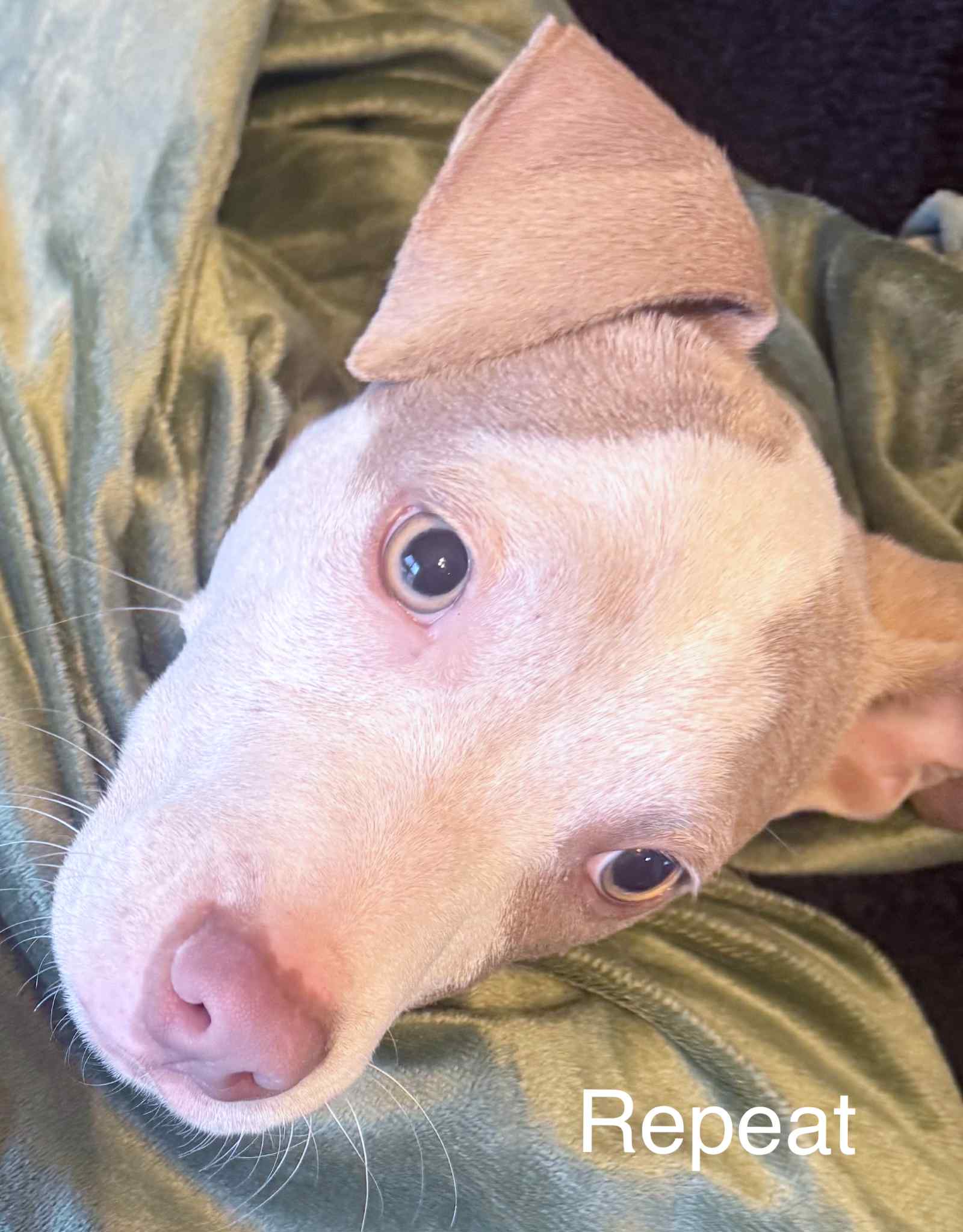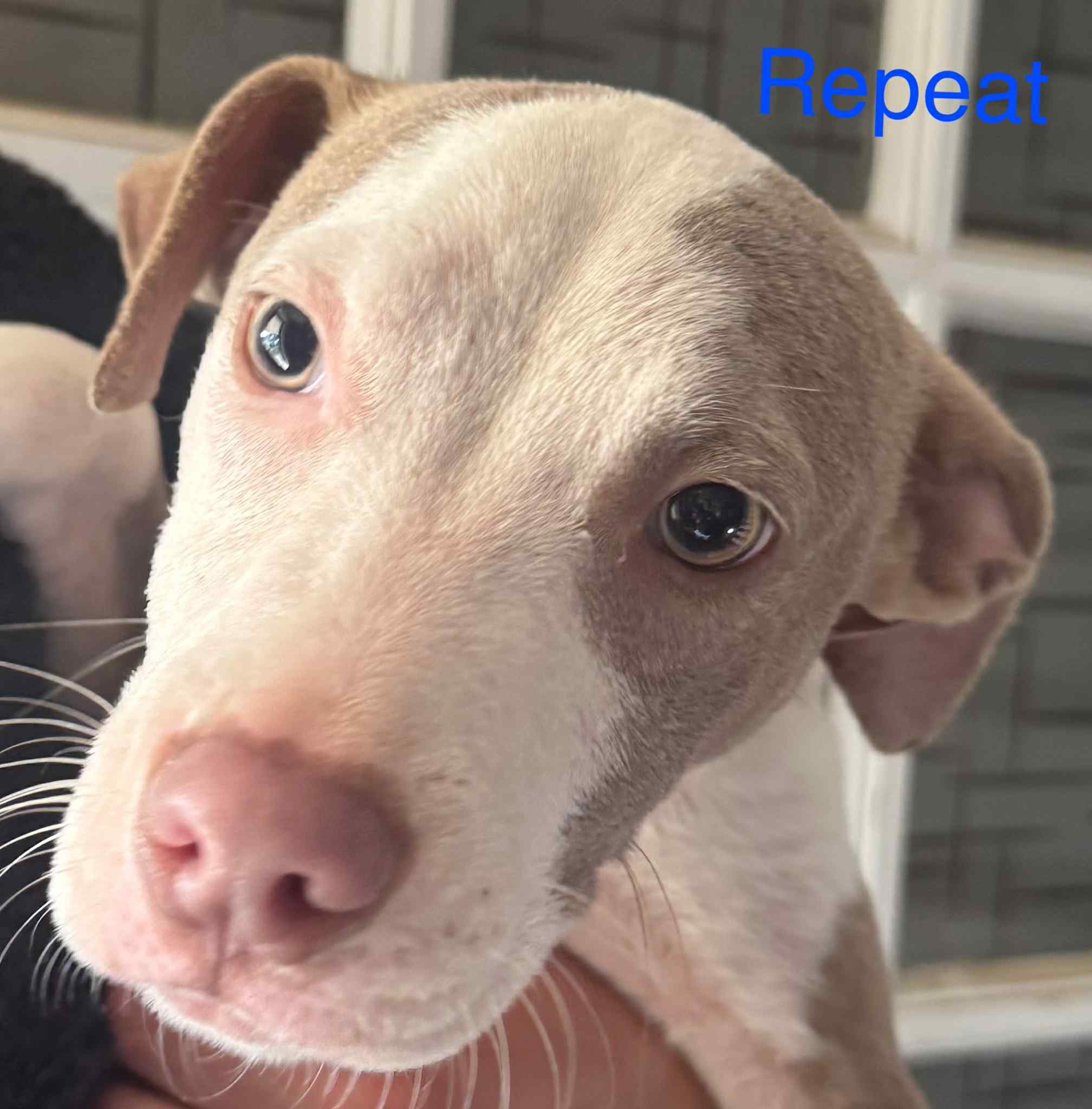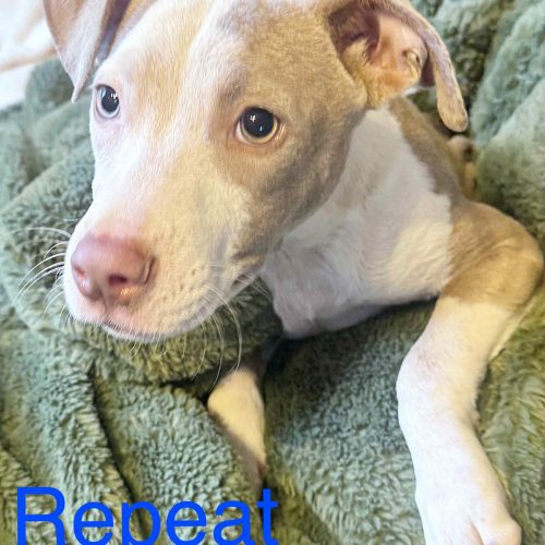 Repeat is the tiniest, cutest little pittie mix—4 months old and powered almost entirely by snuggles and sweetness. He’s basically a pocket-sized shadow who insists on being with you always, even if you’re just walking to the fridge.