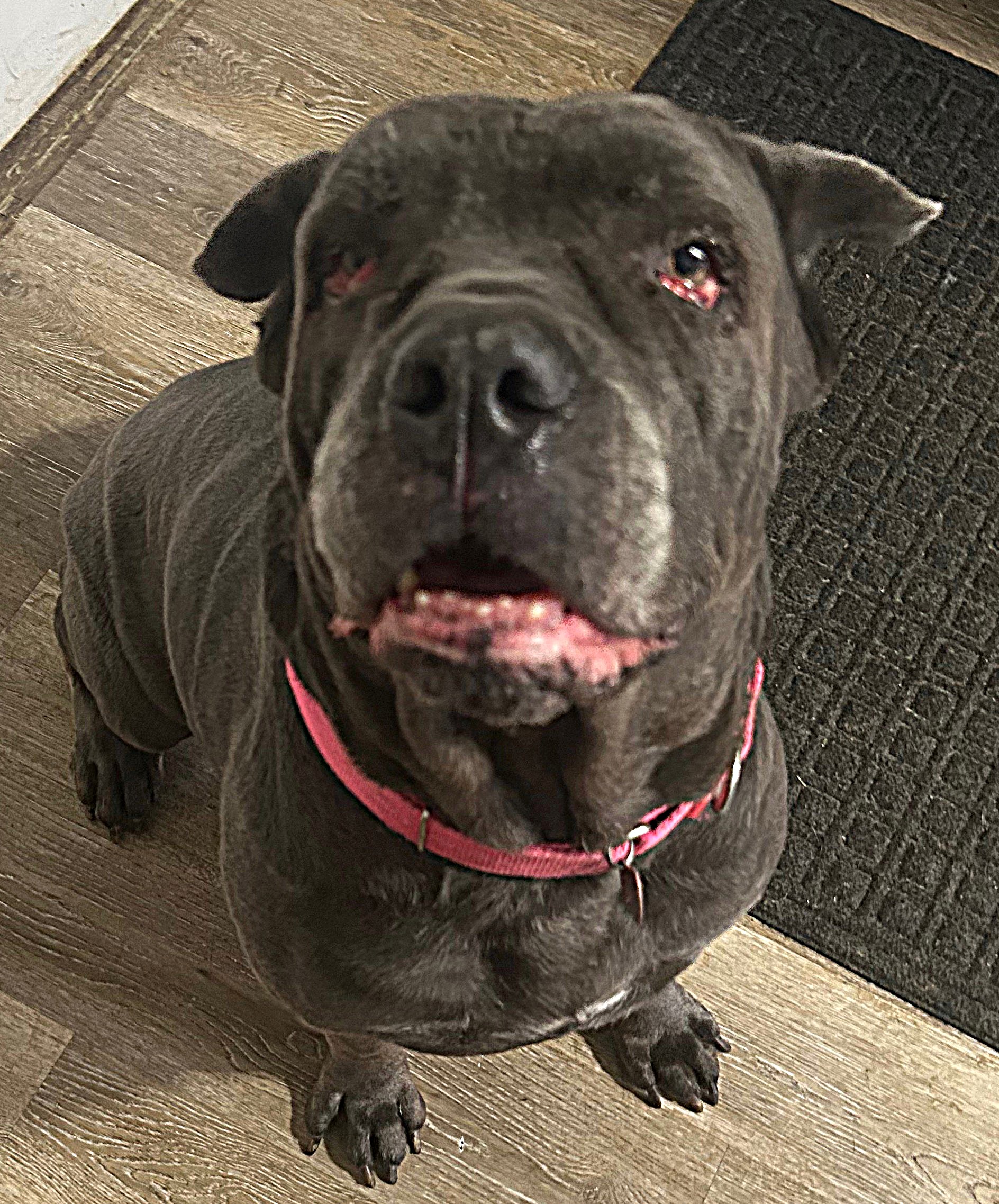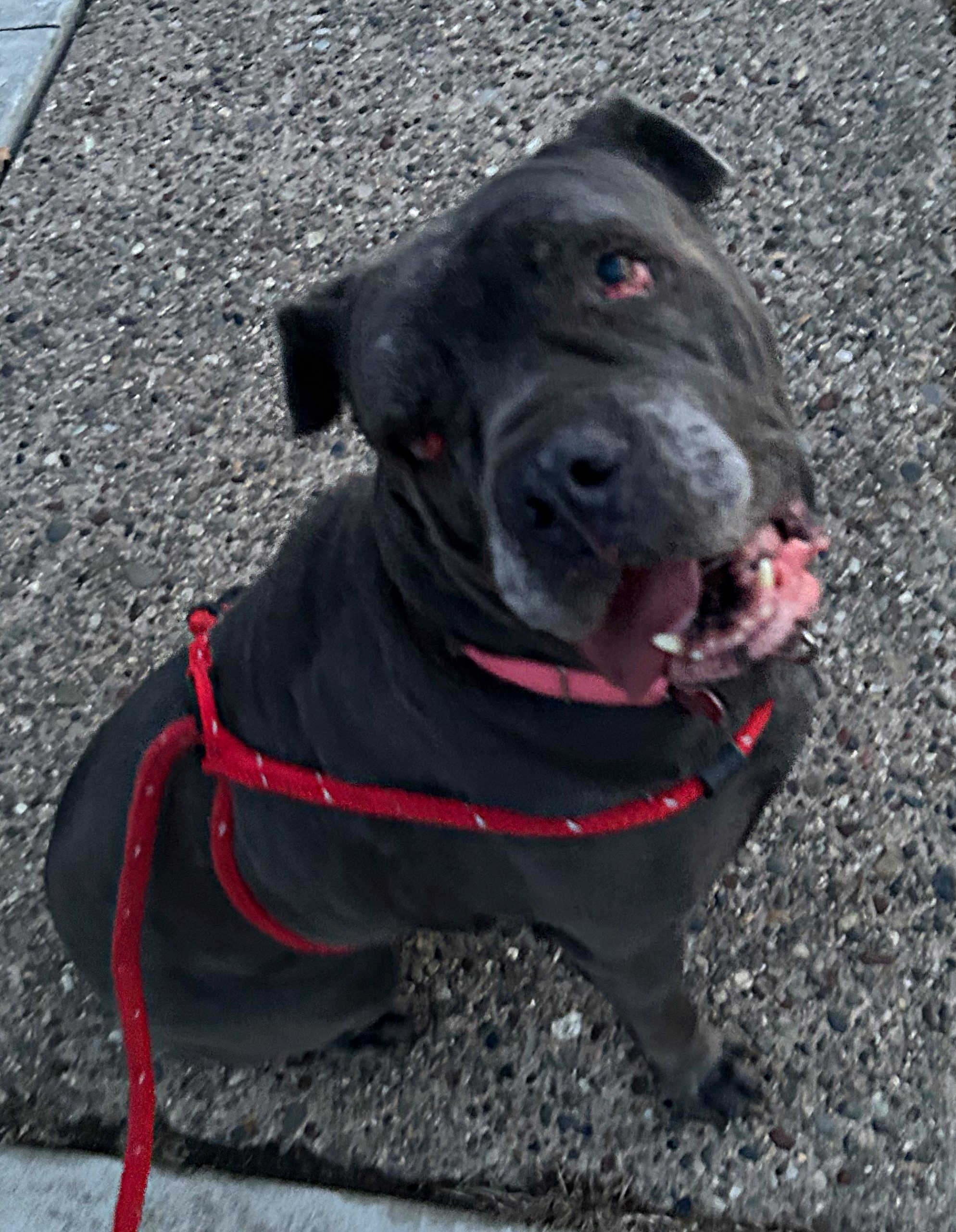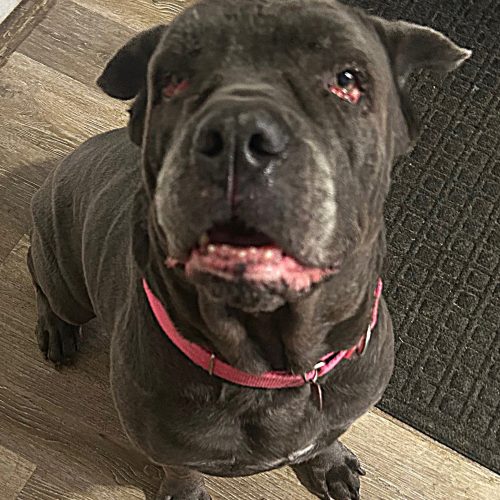 Sussy is a stunning, spayed Cane Corso mix with a soft grey coat that turns heads everywhere she goes. At first meeting, she carries herself with a calm, stoic presence—quietly observing the world around her. But give her a little time, a gentle introduction, and you’ll discover the truth: Sussy is a total love bug who believes, wholeheartedly, that she is a lap dog.