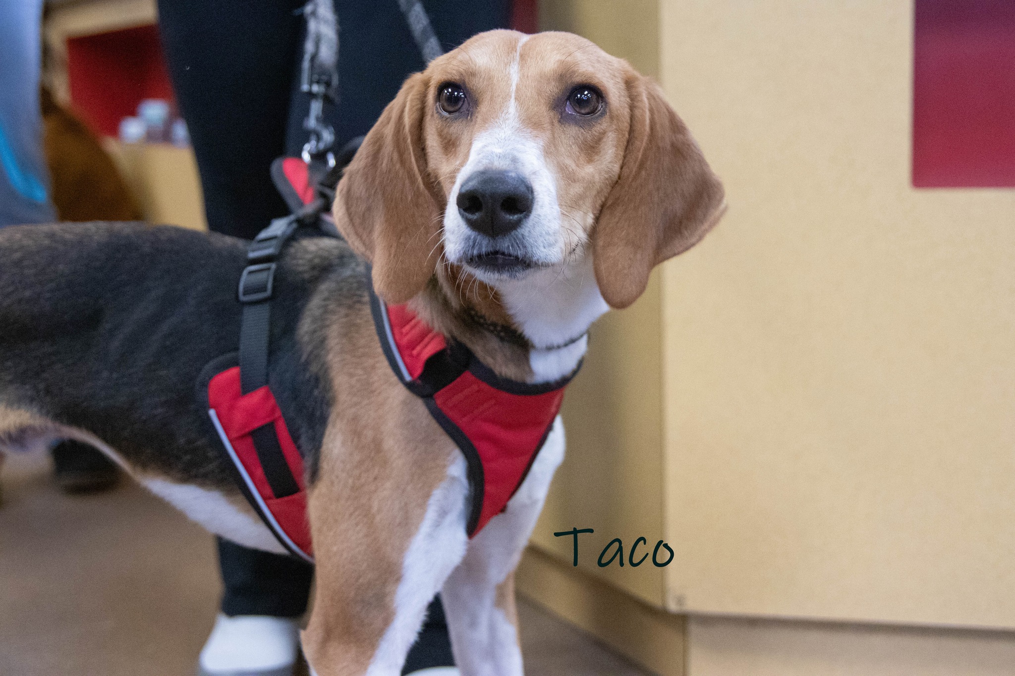 Taco is a 10 month old hound mix. Neutered male. Heartworm negative. He is good w dogs and friendly w cats. He weighs 40 lbs.