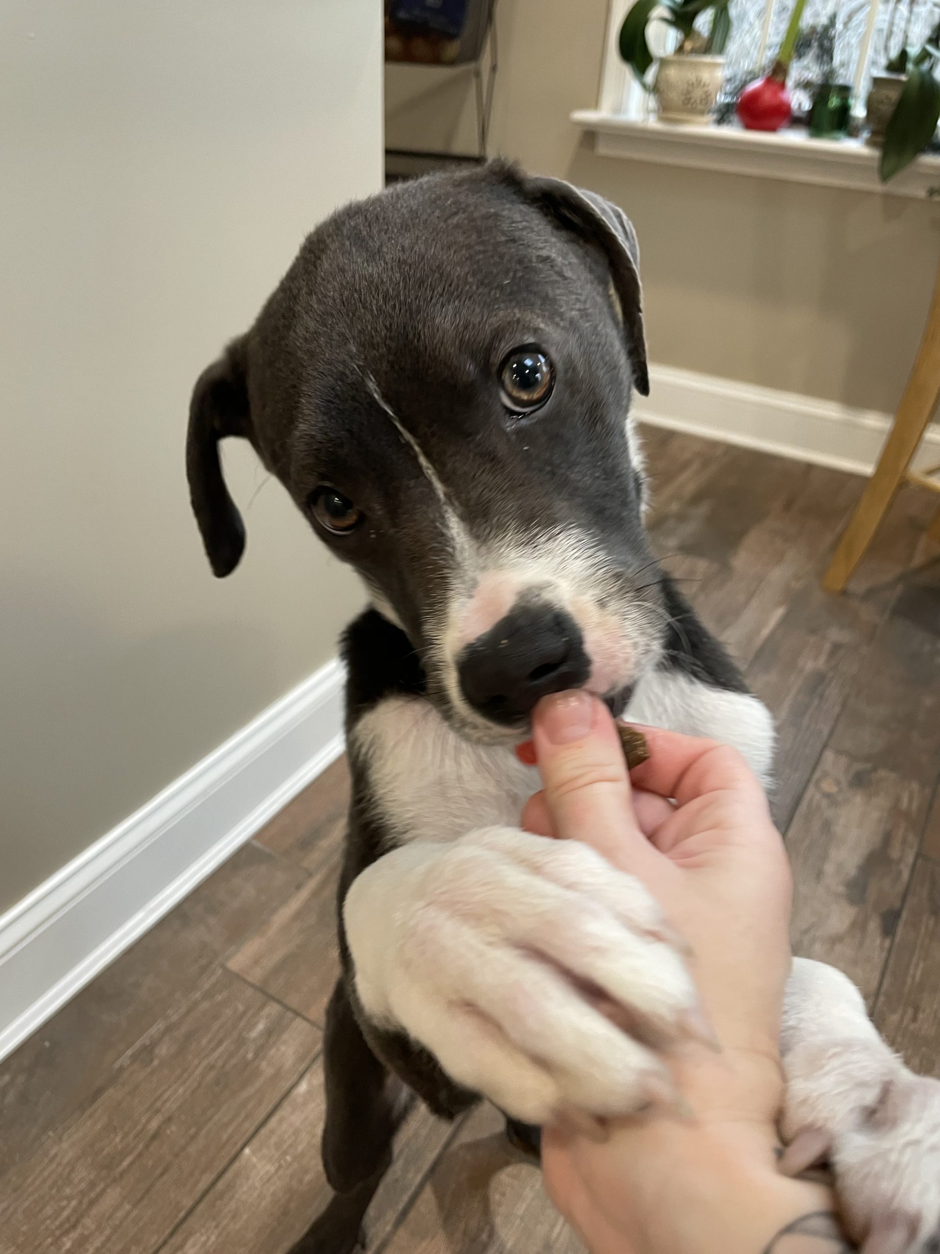 Venus is food-motivated, which makes training easier, and she's currently learning how to sit. She gets along well with other dogs and enjoys being around her people.